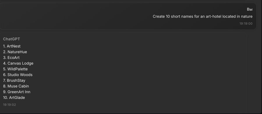 Самое время дать нашему отелю имя! Воспользуемся ChatGPT! Наш отель будет называться Art Nest (Художественное гнездо)