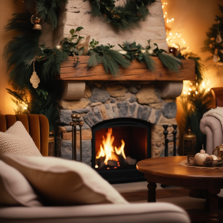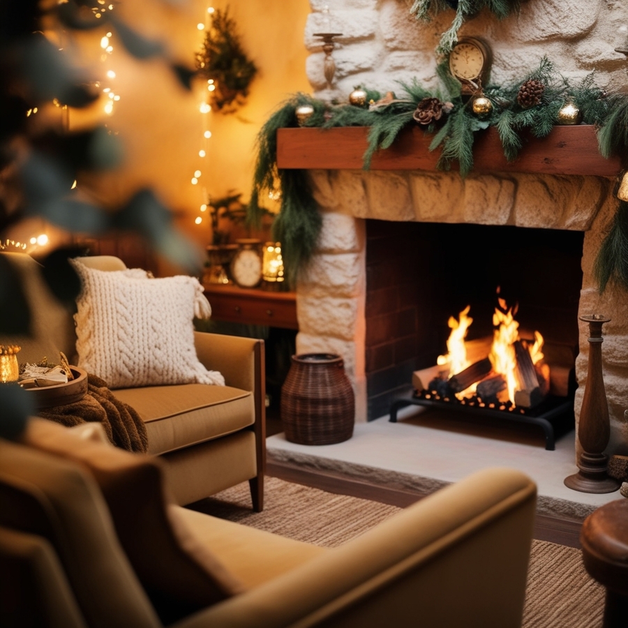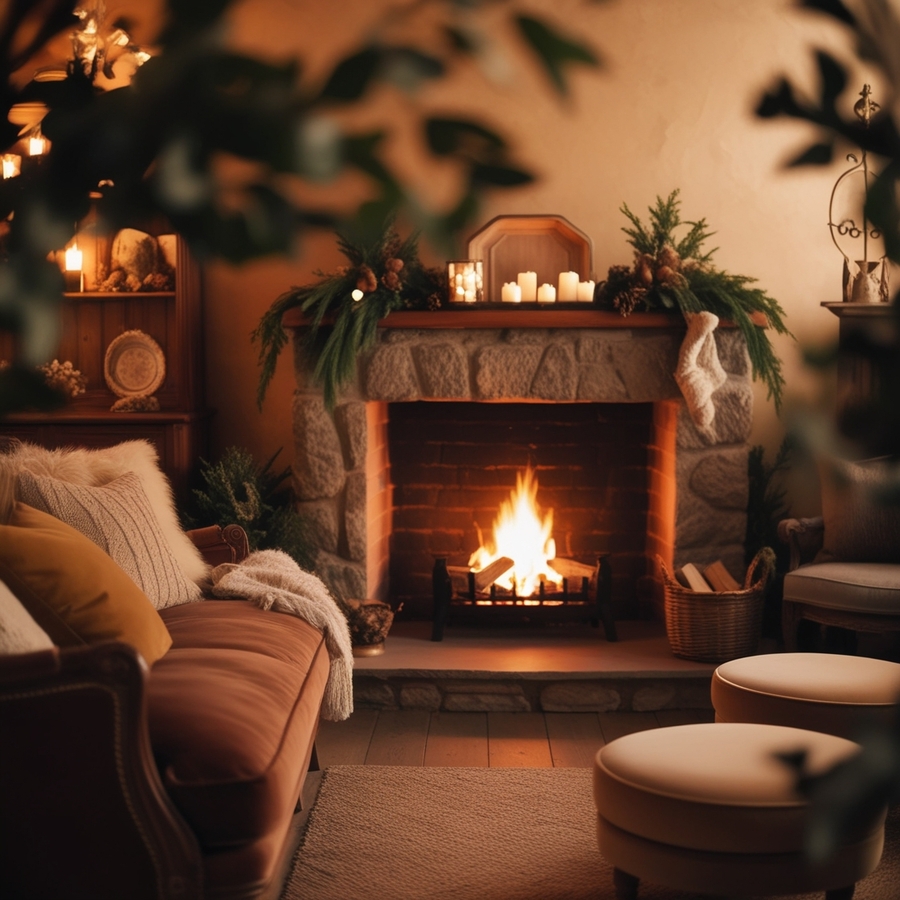 Используемый промпт: a warm and inviting blurred image of a cozy hygge atmosphere, featuring soft golden lighting that casts a comforting glow on plush furnishings, rich wood accents, and crackling flames in a rustic stone fireplace, surrounded by lush greenery and vintage decorations, with a subtle sense of mistiness that evokes feelings of serenity and tranquility.