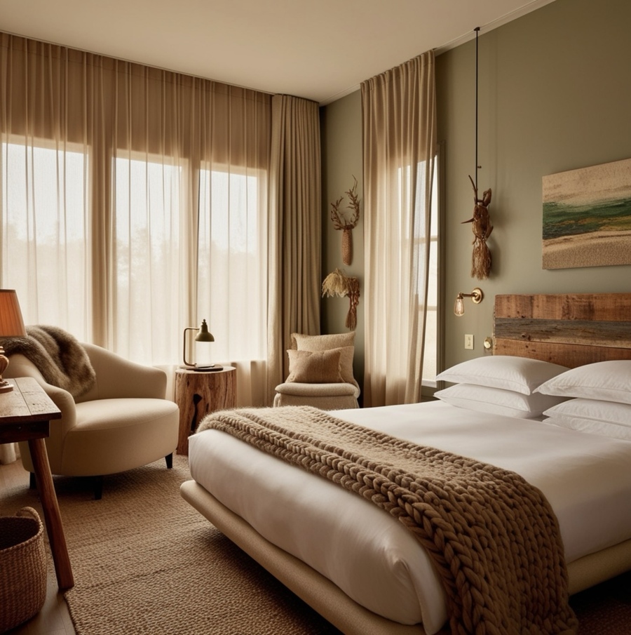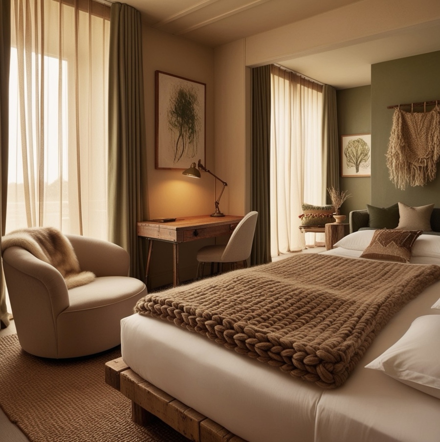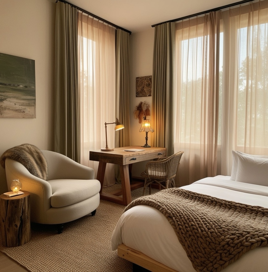 Используемый промпт: a warmly lit, intimate hotel room with plush furnishings and natural textiles, evoking the cozy charm of glamping, at a hygge-inspired art-hotel, featuring a plush, oversized armchair with a faux-fur throw, a reclaimed wood desk with a vintage-inspired lamp, and a comfortable, cloud-like bed with crisp, white linens and a chunky, woven blanket in earthy tones, surrounded by floor-to-ceiling windows with flowing, sheer curtains that filter in soft, warm light, and adorned with original artwork and eclectic, nature-inspired decor in muted colors, such as mossy green, sandy beige, and driftwood grey, creating a serene, retreat-like atmosphere that invites relaxation and creativity.