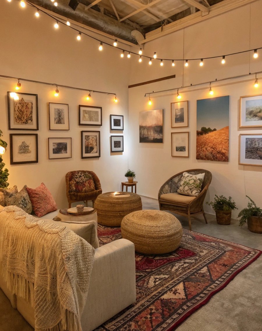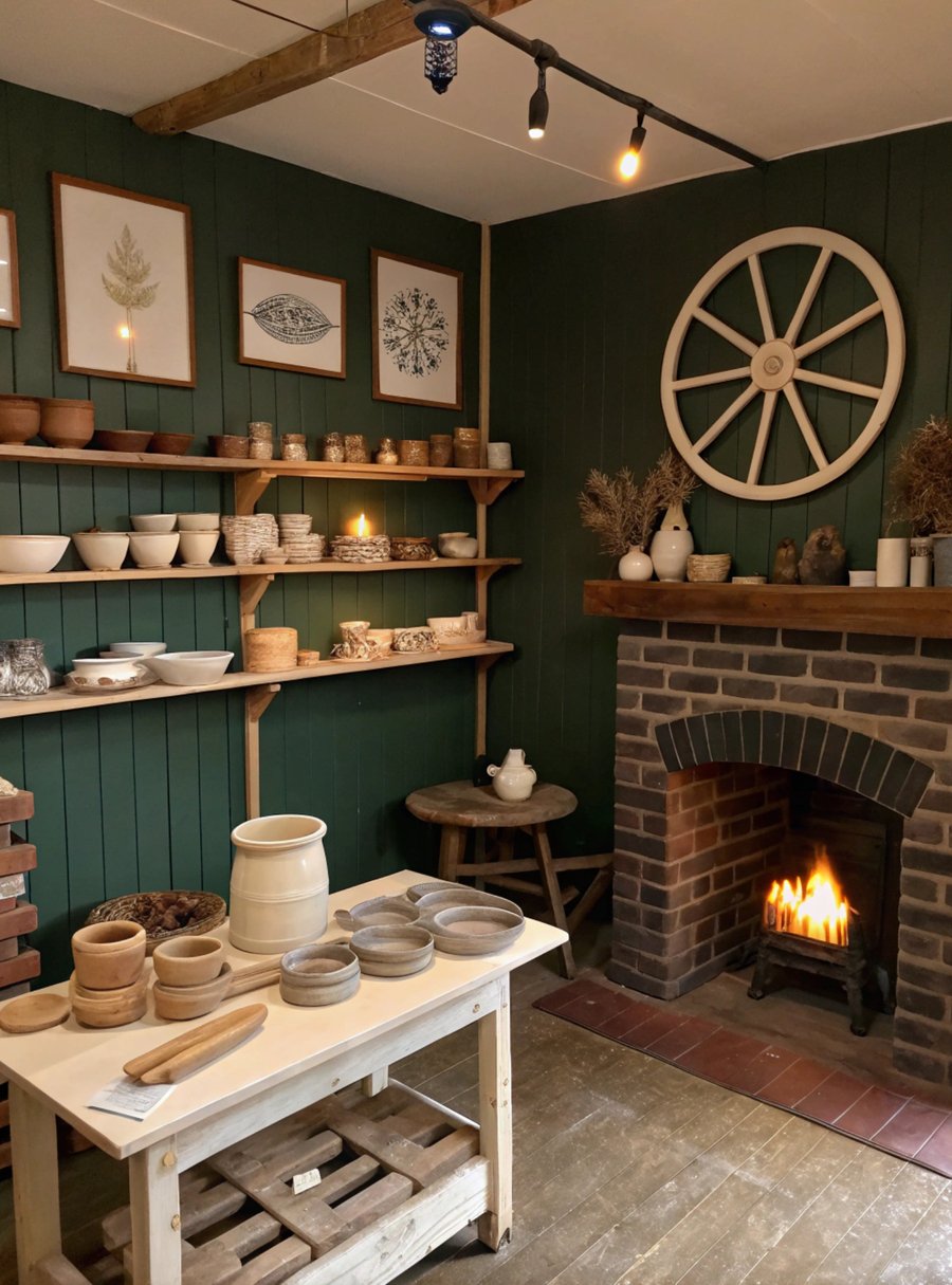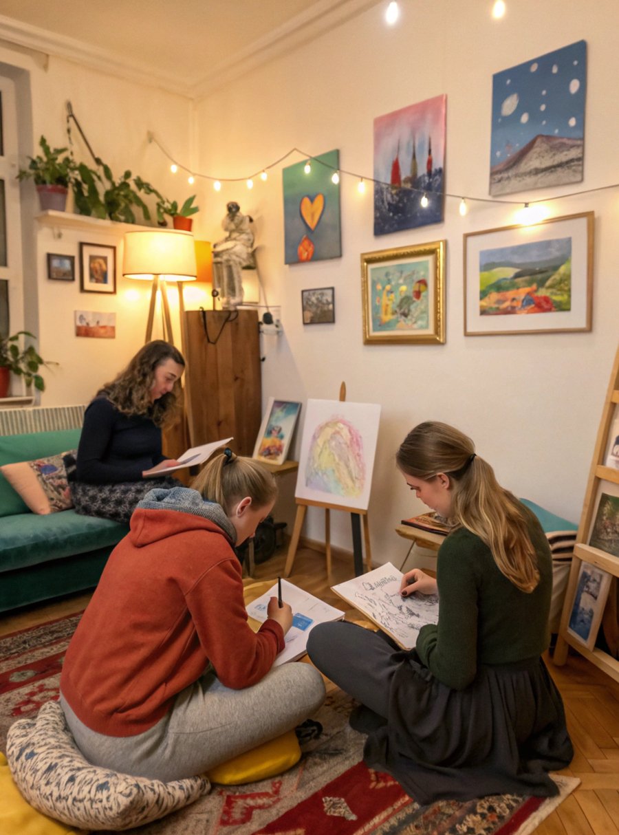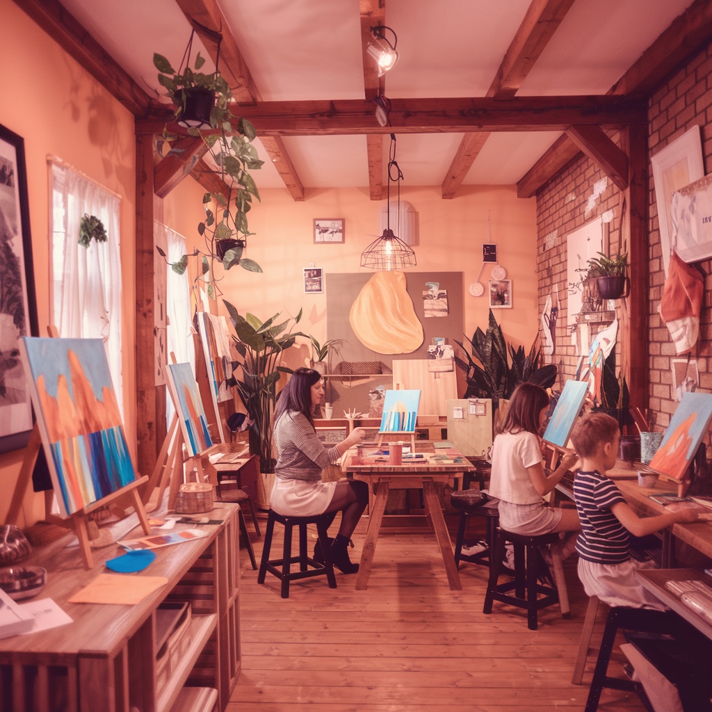 Используемые промпты по порядку: 1. create a cozy hygge pottery workshop using dark brown and green colours 2. A photo of a cozy room full of paintings and art there is a teacher and students 3. A photo of a hygge room filled with paintings and creative items. There is a teacher and three students working on their paintings. The room has a warm, cozy atmosphere with soft lighting.