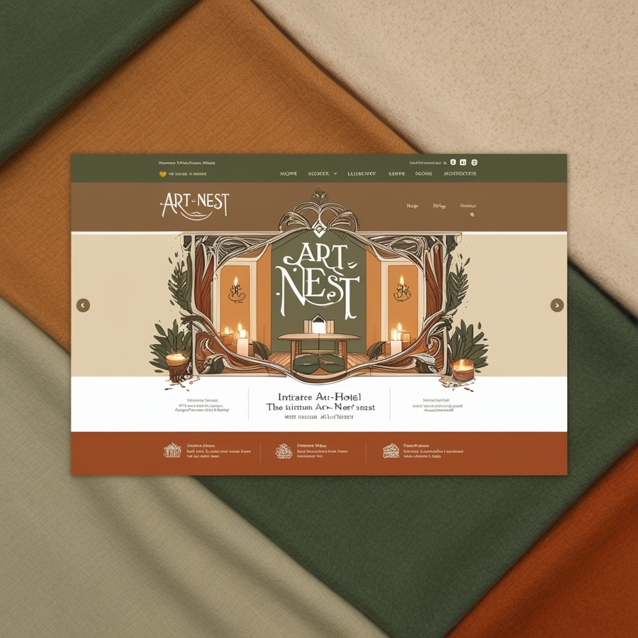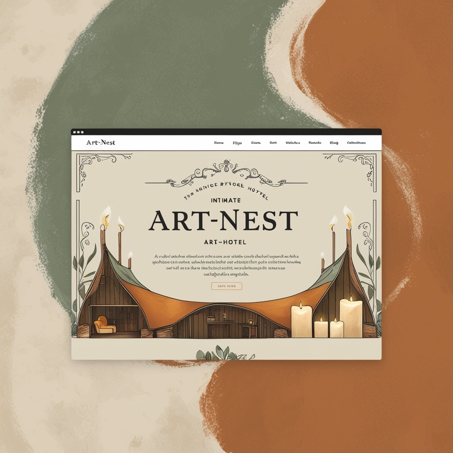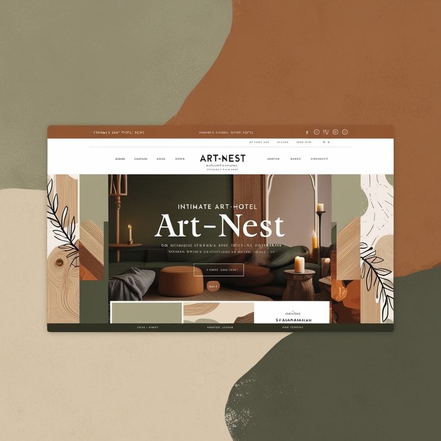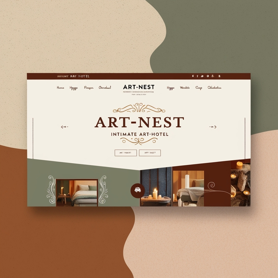 Используемый промпт: a warm and inviting digital illustration of a website for the intimate art-hotel «art-nest», set against a comforting hygge-inspired background with earthy tones of oatmeal, sage green, and burnt orange, featuring a serene layout with elegant typography, possibly in a serif font, and ornate design elements reminiscent of Scandinavian minimalism, with accents of natural wood and soft candlelight, perhaps incorporating subtle textures and patterns, conveying a sense of cozy relaxation and creative inspiration, as if the hotel itself is a canvas waiting to be explored.