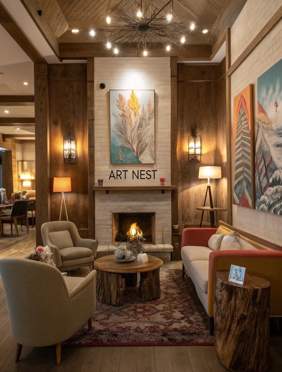 Используемый промпт: a warm and inviting advertisement booklet for art-nest, an art-hotel that embodies the essence of hygge comfort, featuring a harmonious blend of earthy tones, soft textures, and elegant typography, with rustic wooden accents, candles, and lush greenery, showcasing art workshops and cozy nooks, surrounded by vibrant artwork, paintings, and eclectic furniture pieces, with golden lighting casting a warm glow, and subtle Nordic patterns and motifs adding a touch of Scandinavian charm, the booklet’s cover adorned with a minimalist logo featuring a stylized letter «A» made up of delicate brushstrokes, in a soothing color palette of mossy greens, earthy browns, and creamy whites, evoking a sense of tranquility and creative escape.