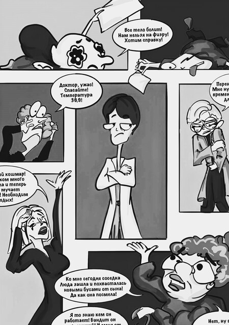 в комиксе рассказывается о конфликте между врачом и пациентами симулянтами, которые отнимают его время и не дают позаботиться о тех, кто нуждается в помощи. В конце концов, даже самого стойкого врача можно вывести из себя.