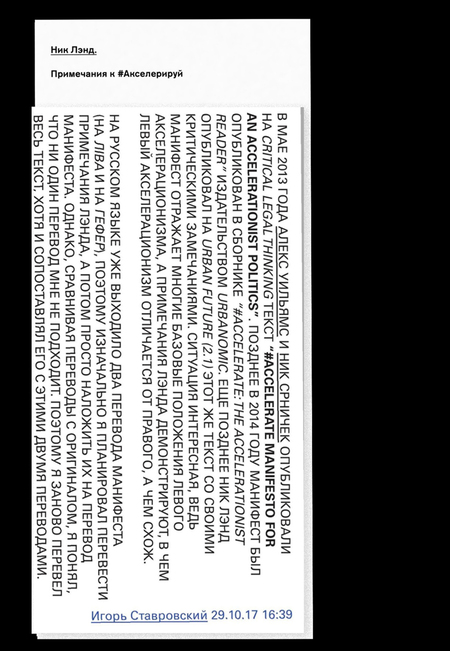 задача: i развести текст разного авторства: в статье есть комментарии переводчика, текст самого манифеста и комментарии ника ленда — сложности с соотнесением того, кому принадлежит тот или иной текст/комментарий, поэтому главной задачей при верстке буклета я поставила перед собой именно легкость восприятия, без постоянной оглядки на то, правильно ли читатель понимает, кому именно принадлежит авторство строк