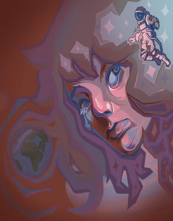 The theme of this painting is Big and small. The painting depicts a mythical creature that is in space, her hair turns into a cosmic nebula (cluster of stars), and a planet (earth) can also be seen in her hair. The creature is watching the astronaut, who is very surprised by his find. I tried to portray the mystery of space, as it has inspired and fascinated me since childhood.