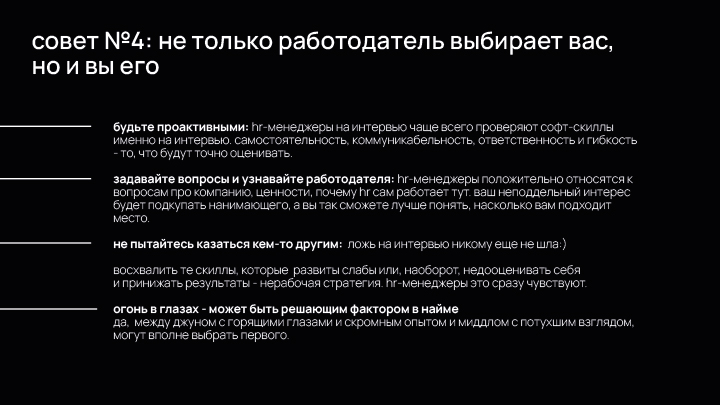 Необходимо, чтобы портфолио и подача работы вызывали доверие и демонстрировали ответственность кандидата. На этапе интервью, помимо оценки опыта, внимание обращается на коммуникативные навыки, логичность ответов, способность задавать правильные вопросы и умение говорить о себе. Были даны рекомендации по тому, как готовиться к интервью, как проявлять инициативу и интерес к компании.