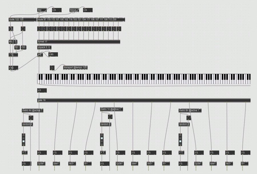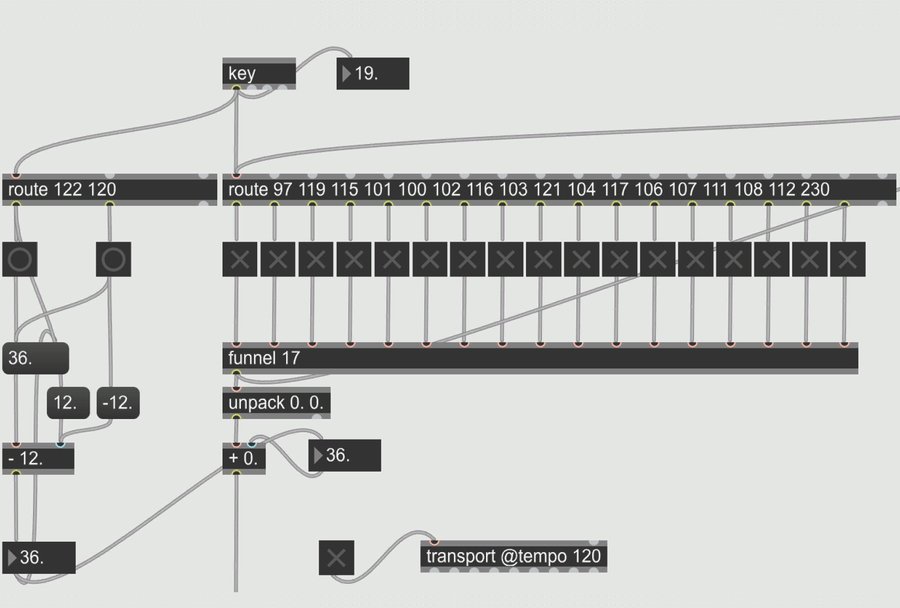 В ходе занятия студенты осваивают интегрирование midi-устройств в Max/MSP. Данный патч показывает, как можно управлять устройством с помощью компьютерной клавиатуры.