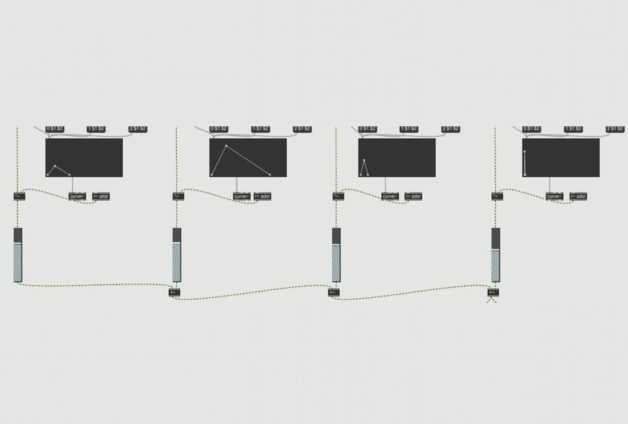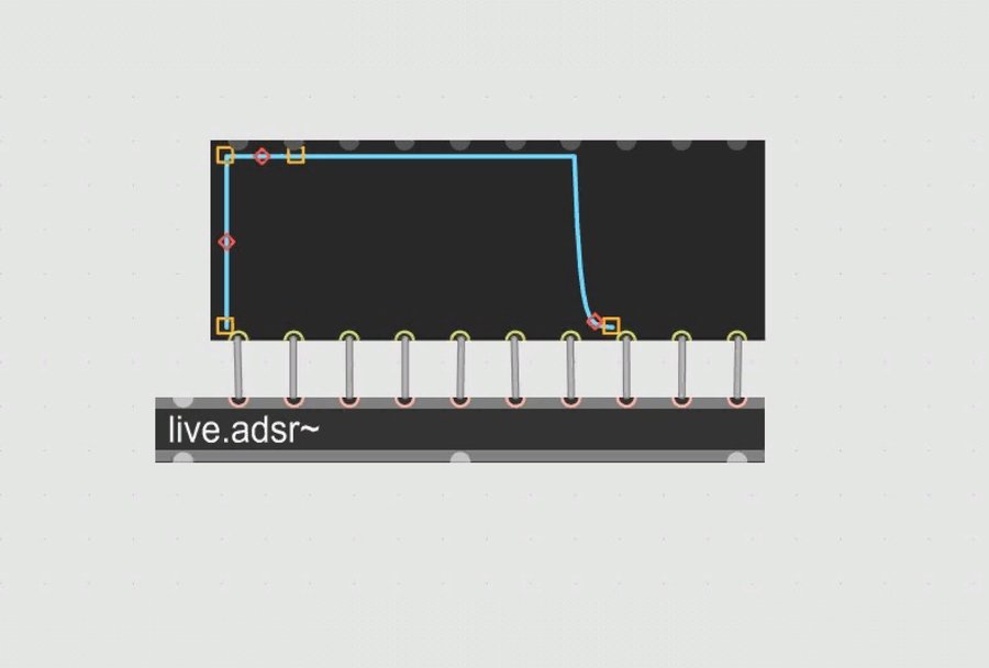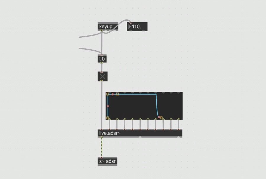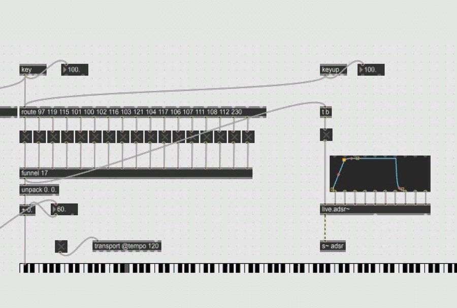 Использованные объекты: key keyup flonum route button toggle unpack + - message send~ return~ live.adsr~ live.adsrui