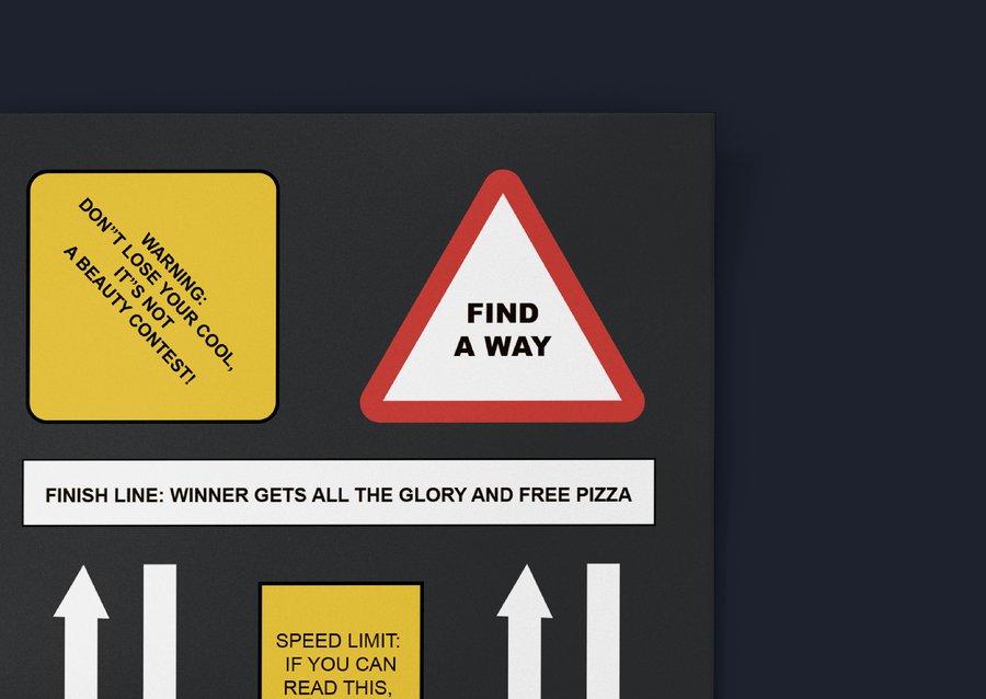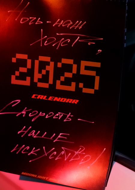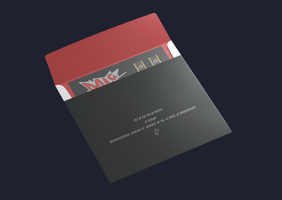 Календарь от организации ночных гонок «Moonlight races» — это 12 плакатов, набор стикерпаков, белый перманентный маркер и магнитная машинка.