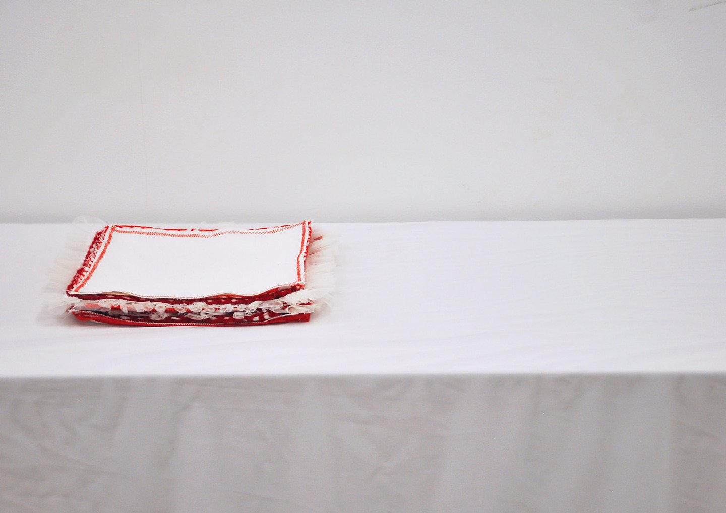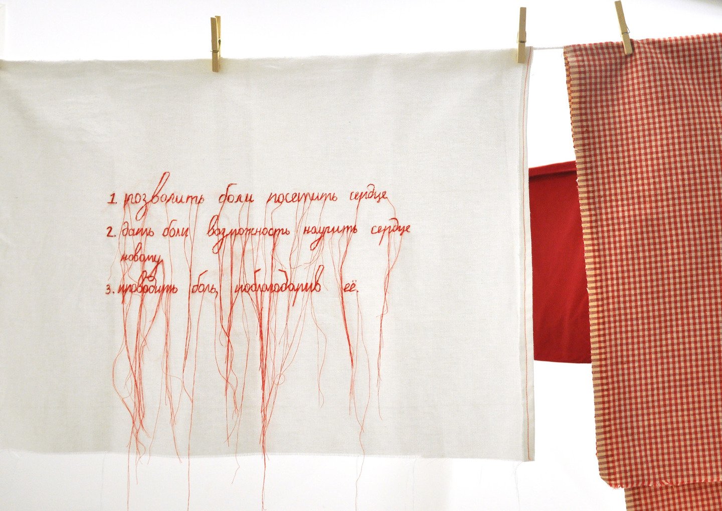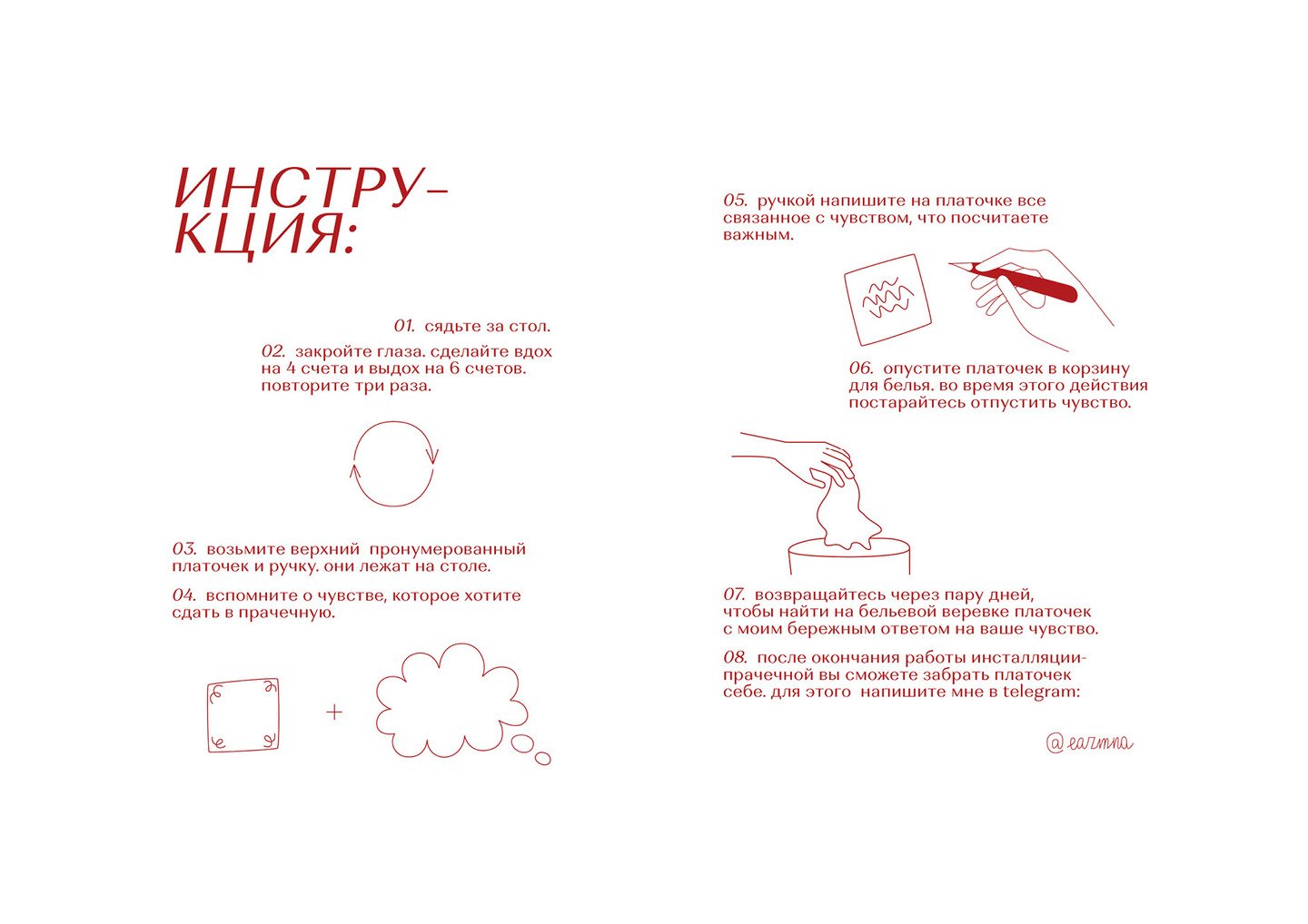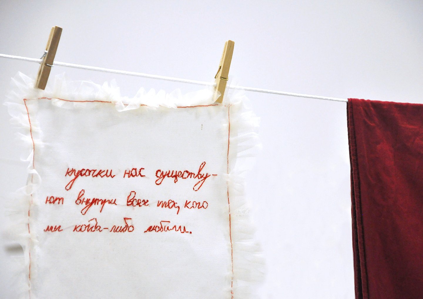 1. Зритель «отдает» чувство, написав о нем ручкой на платке 2. Художница отстирывает платок, высушивает и вышивает на нем ответ 3. Платок вешается на бельевую веревку, становясь частью инсталляции. Зритель приходит второй раз и читает ответ