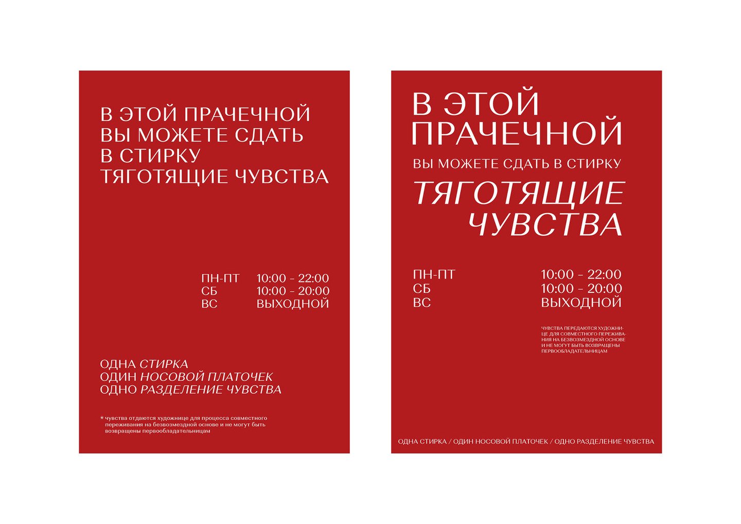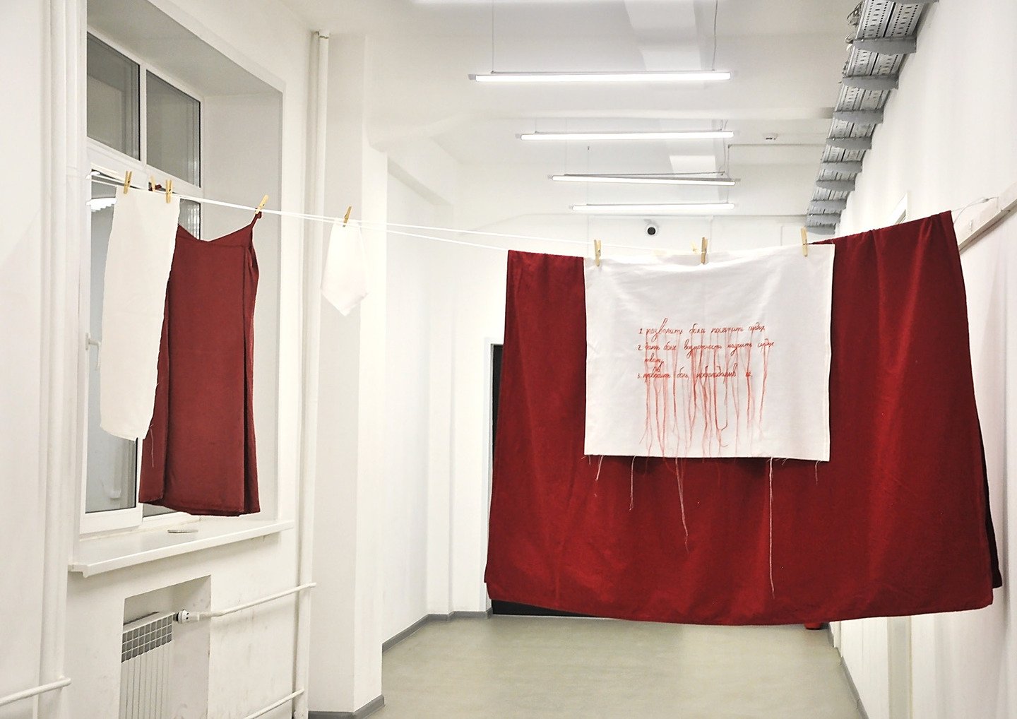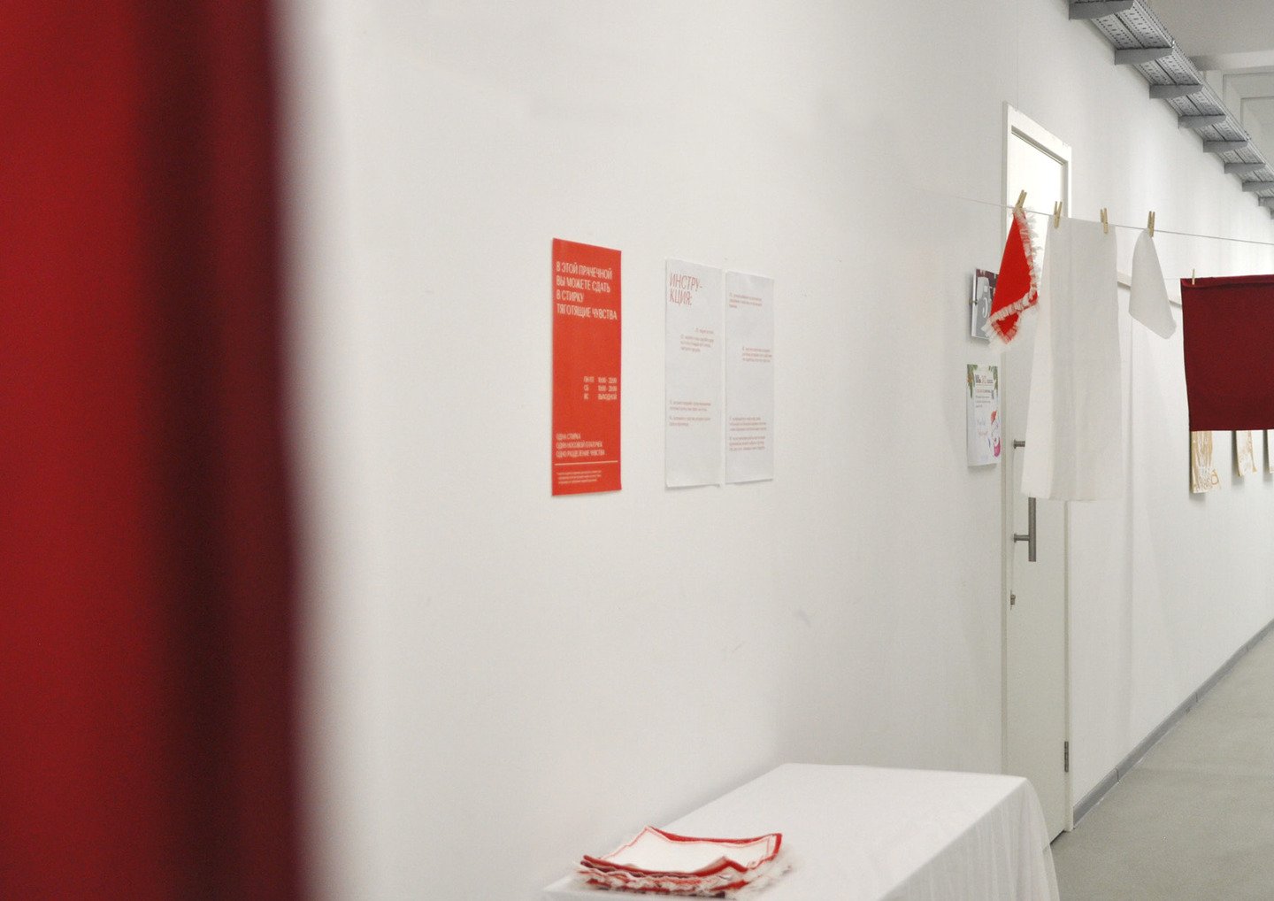 Форма проекта родилась из размышления о границах между этапами взаимодействия инсталляция представляет собой прачечную: натянутые между стенами бельевые веревки, на которых сушатся вещи  и, соответственно, платки.