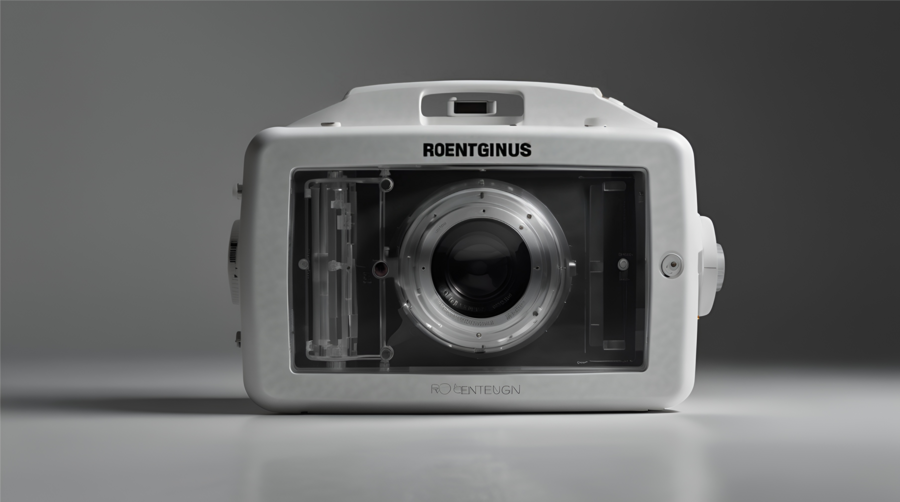 1. A sleek, futuristic portable small white x-ray device looking like an everyday camera with a white background, featuring the word «ROENTGENIUS» on a device in bold, modern font.