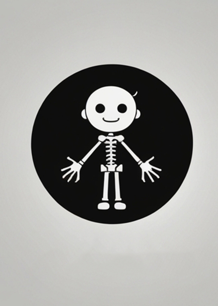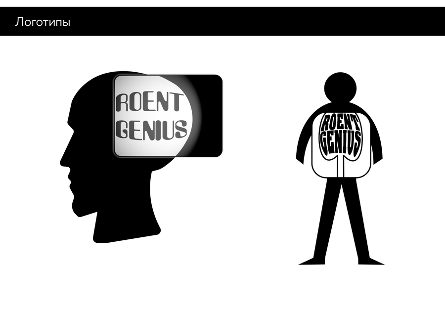 2. 2D minimalistic black and white logo for a brand called «ROENTGENIUS» on a white background with a cartoon stickman character with his lower body being visible x-ray