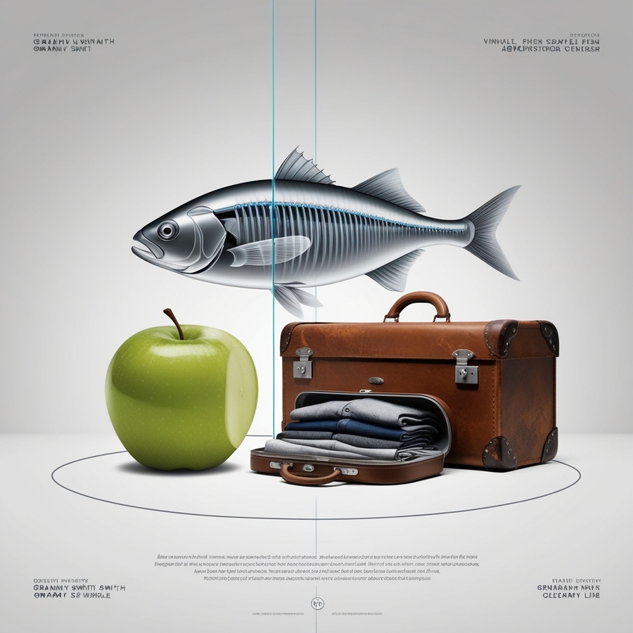 3. a breathtakingly detailed, minimalist advertisement poster illustration featuring a crisp, juicy, Granny Smith apple, a sleek, silver fish with a subtle sheen, and a vintage, worn, brown leather suitcase, all positioned in a harmonious, asymmetrical composition, with a faint, blue-gray x-ray line dissecting each object, revealing the intricate inner mechanisms and structures inside, such as the apple’s core, the fish’s skeletal system, and the suitcase’s neatly organized clothing and accessories, set against a clean, white background, with bold, sans-serif typography and ample negative space, created in a stylish, modern aesthetic with precise lines, smooth curves, and subtle textures, all rendered in ultra-high resolution with impeccable attention to detail.