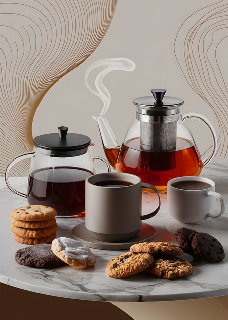 prompt: «A stylish and contemporary desktop wallpaper featuring an array of tea, coffee, and cookies. The tea is shown in an elegant glass teapot with a steaming infuser, while the coffee is served in a sleek, modern mug. An assortment of delicious cookies, such as chocolate chip, sugar, and oatmeal, are placed on a marble tabletop. The overall color scheme is warm and inviting, with soft golden and brown tones. The background features a subtle abstract pattern of swirling lines and shapes, creating a visually appealing and modern design.»