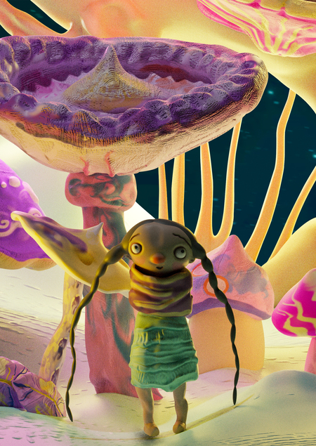 Девочка попадает на островок в волшебном лесу, который окружен гигантскими грибами, охраняющими хижину на дереве.