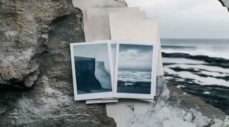 Промт: /imagine minimalistic hand-drawn postcards of Icelandic landscapes by Kelly Beeman, featuring rugged volcanic cliffs, misty seaspace and cold sand under an overcast sky. Use a cool, muted color palette with stormy blues, deep grays, and hints of silvery white. Arrange these postcards in an atmospheric setting, as if they were photographed on a natural, textured stone beach with soft, diffused light that enhances the moody and serene northern vibe. Muted tones, creating a serene and slightly melancholic coastal scene --v 6.1 --ar 16:9