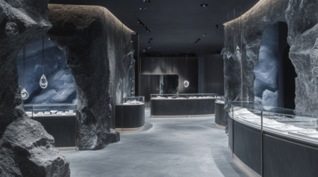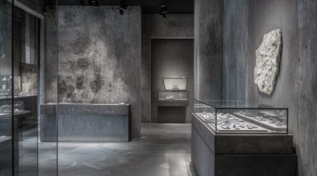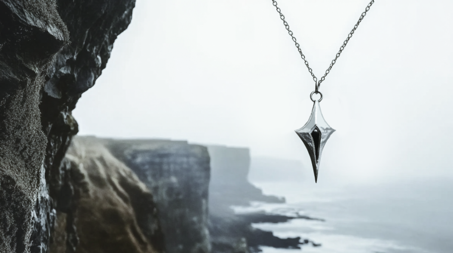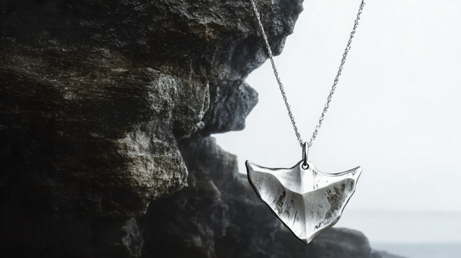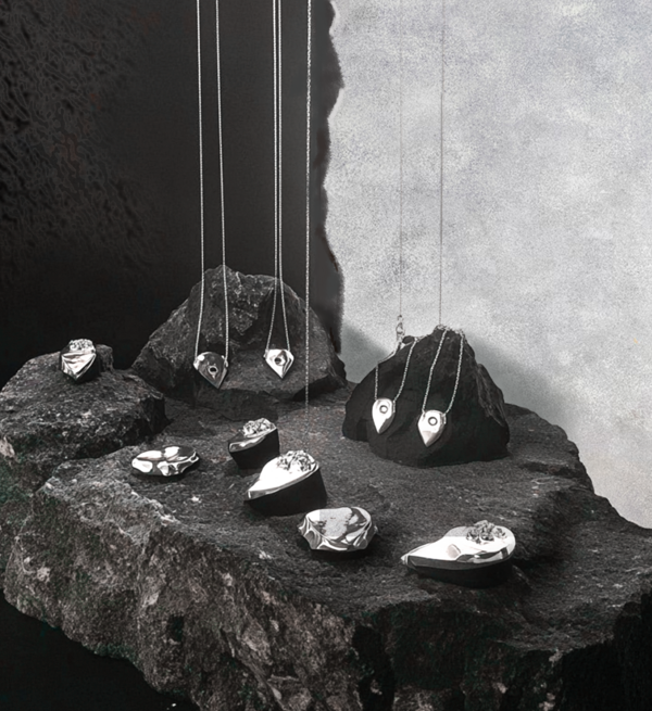 — Витрина: /imagine a still life of silver jewelry pendants, featuring heart-shaped motifs with piercing details, displayed on dark gray and black rocks, against a stark contrast of off-white and black backdrop; textures should mimic the rough, stone-like surface of the rocks.