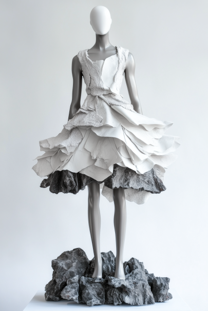 — /imagine a full front shot of mannequin dressed in high fashion foldsed dress maded of white satin with details maded of dark neutral textured rock --ar 2:3 --v 6.1
