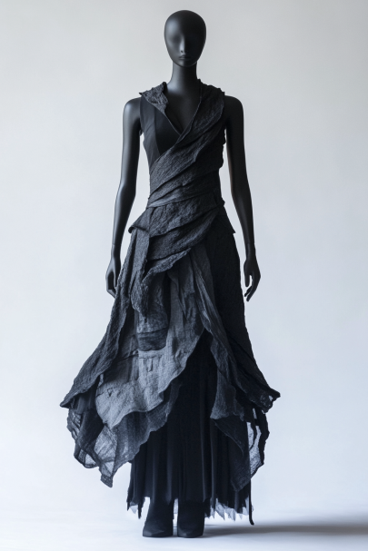 — /imagine a full front shot of mannequin dressed in high fashion foldsed dress maded of black satin with details maded of dark neutral textured rock --ar 2:3 --v 6.1
