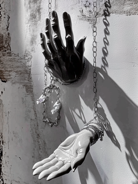 — Руки: /imagine a grayscale image of two sculpted hands, one dark, one light, attached to a wall with chains and decorative jewelry; the hands are realistic in shape and form, with intricate details in the textures of the skin and the chains, casting dramatic shadows on a rough-textured, light gray wall.