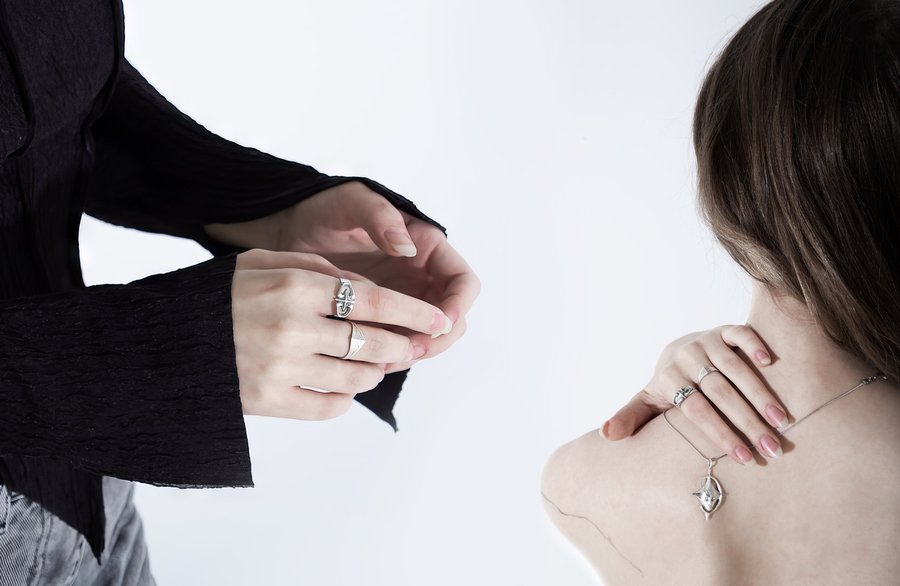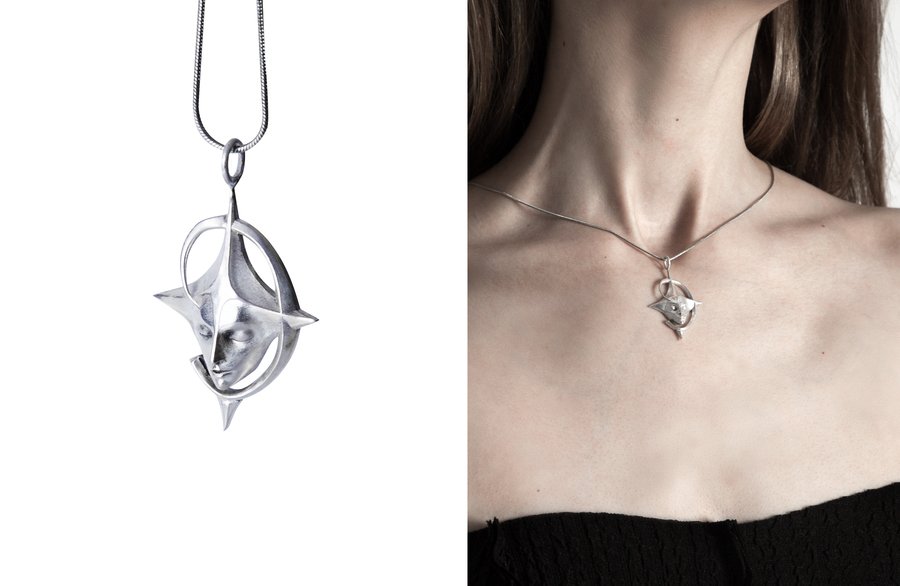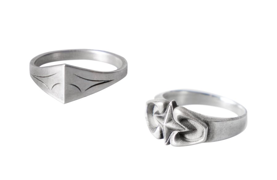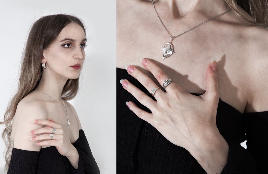 — Подвеска: /imagine a big simple handmade silver pendant in a form of round and star, crumpled form, White background --v 6.1 — Кольцо верхнее: /imagine a simple silver ring with vintage star. Simple clear aury forms. White background --v 6.1 — Кольцо нижнее: /imagine a simple silver edgy ring with aury vibe. Simple clear aury forms. White background --v 6.1