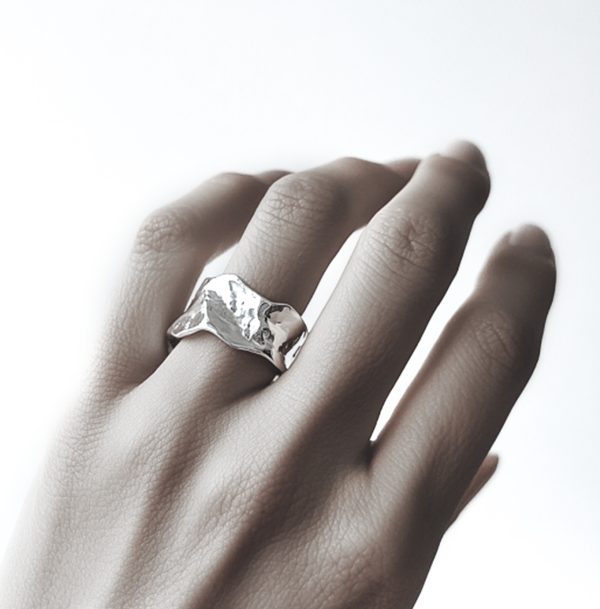— Альтернативная коробочка для украшений: /imagine semi-open ring box in the form of a natural smooth silver, silver ring inside, white background --v 6.1
