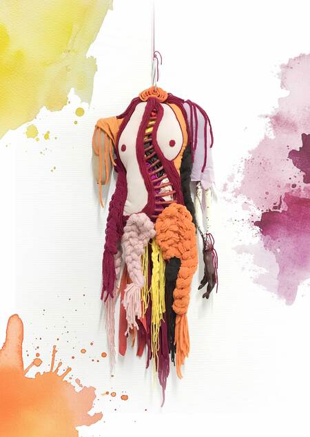 Полая внутри скульптура имеет в основе проволочный каркас, комбинируя жесткую форму и мягкую текстильную текстуру.