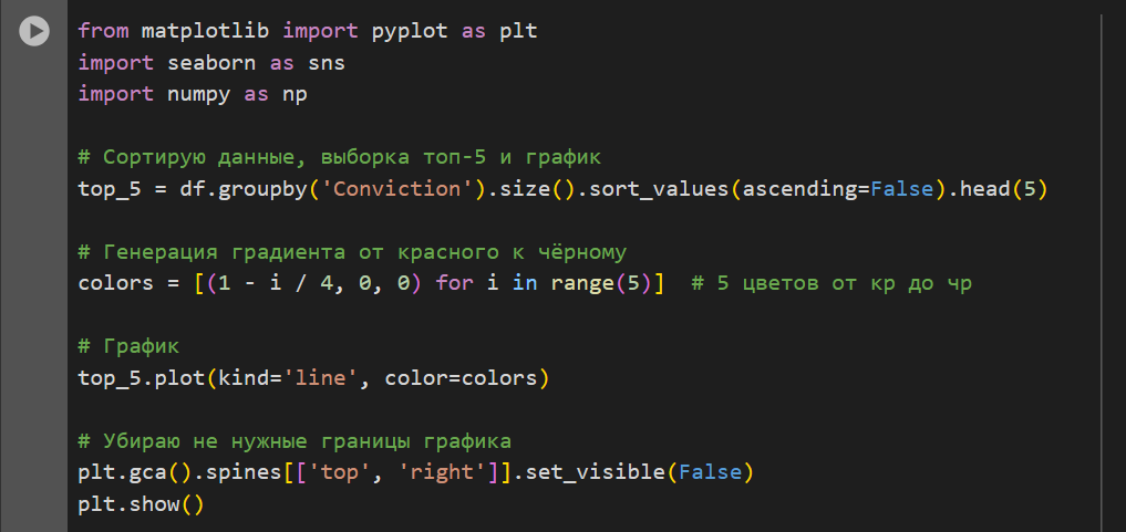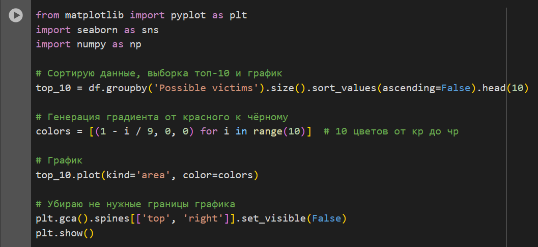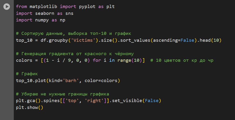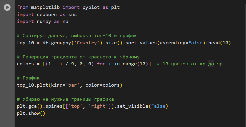 Попробовав в первый раз создать диаграмму, я поняла, что нужно какое-то ограничение, так что ограничила до 10 показателей в графике, а в некоторых случаях даже меньше. Сперва выполняется группировка данных в датафрейме по столбцу, затем считается количество записей для каждого уникального значения в этом столбце. Потом данные сортируются по убыванию и выбираются первые 10