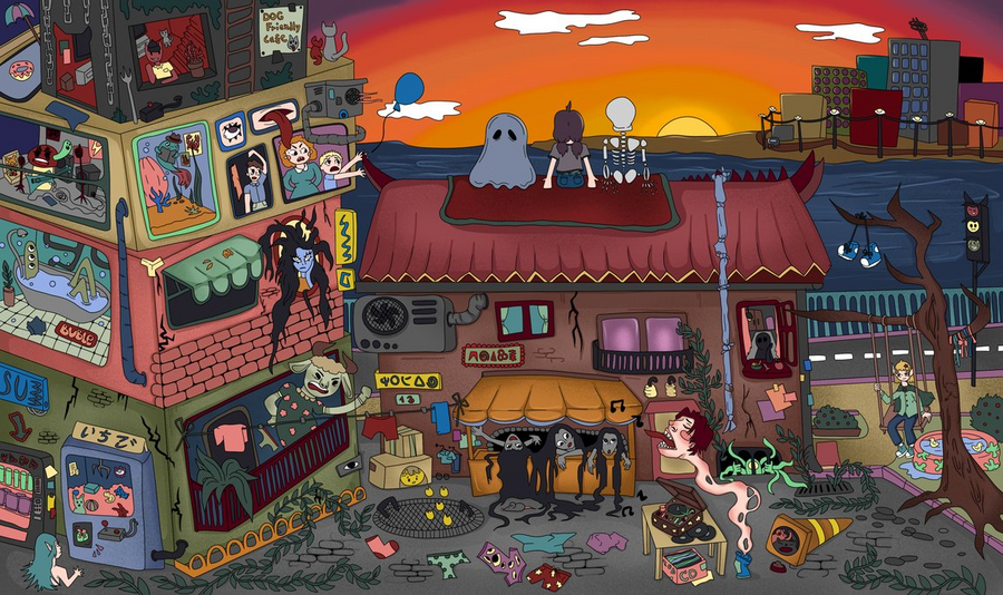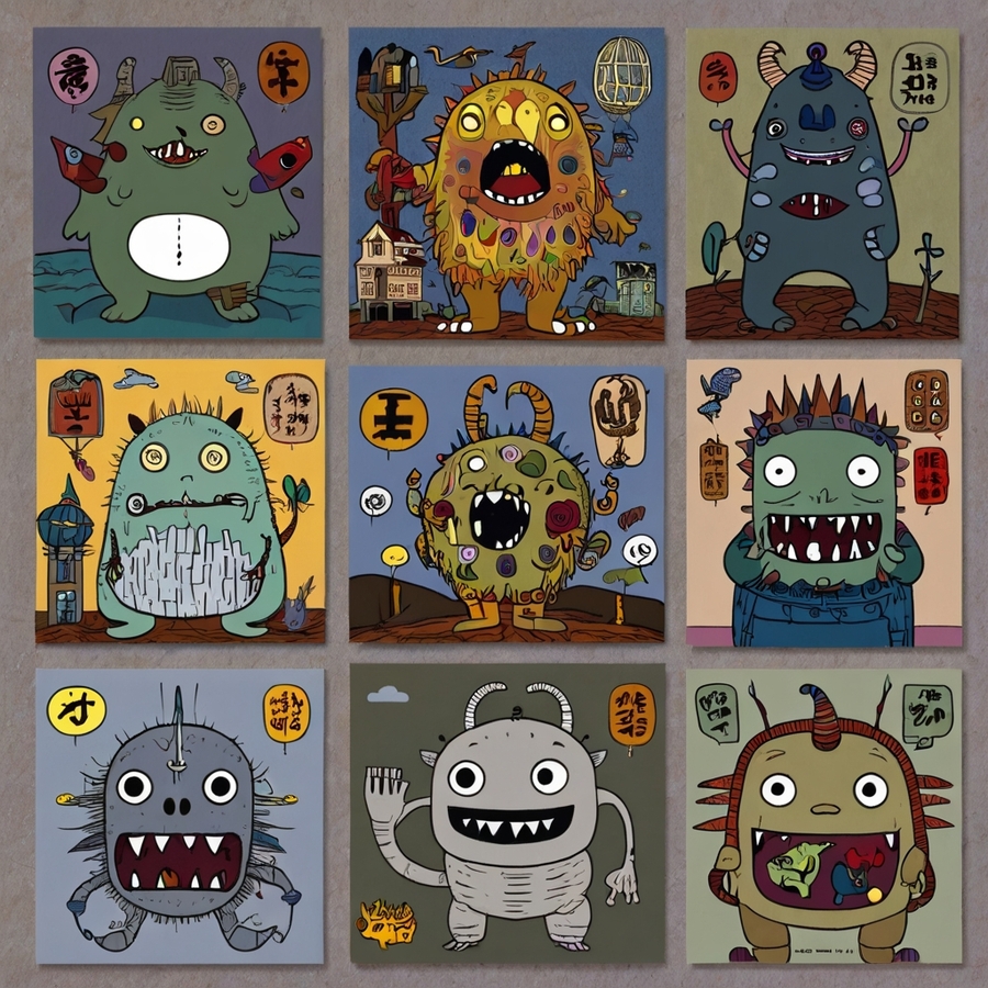Промпт: several detailed illustrated postcards in Japanese vector style. They depict a large number of different monsters, plots, and objects. The illustrations on the postcards are made in muted natural green, red, blue and yellow colors. The character is childish and naive