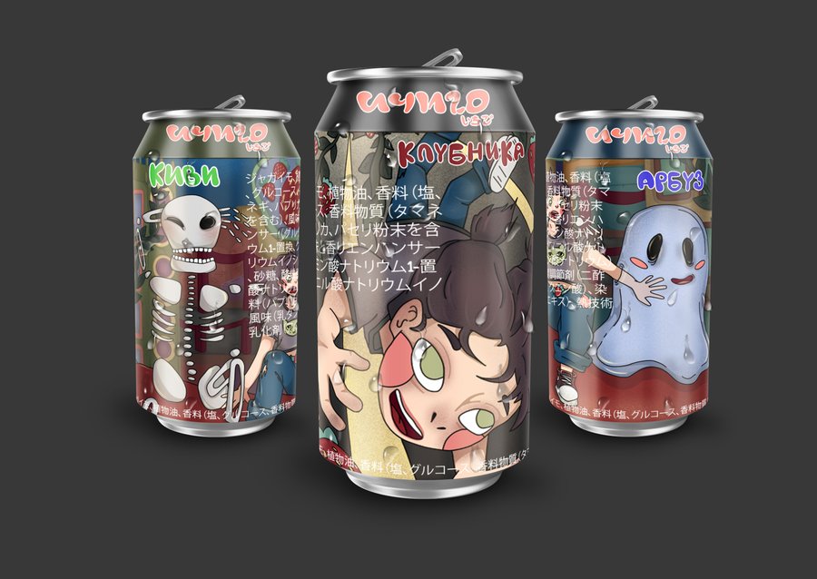 Промпт: Vertical illustrated brochures for the brand in Japanese vector style. They depict monsters and other objects. The illustrations on them are made in muted natural green, red, blue and yellow colors. The character of a child is naive. It shows inscriptions in Japanese and flying strawberries