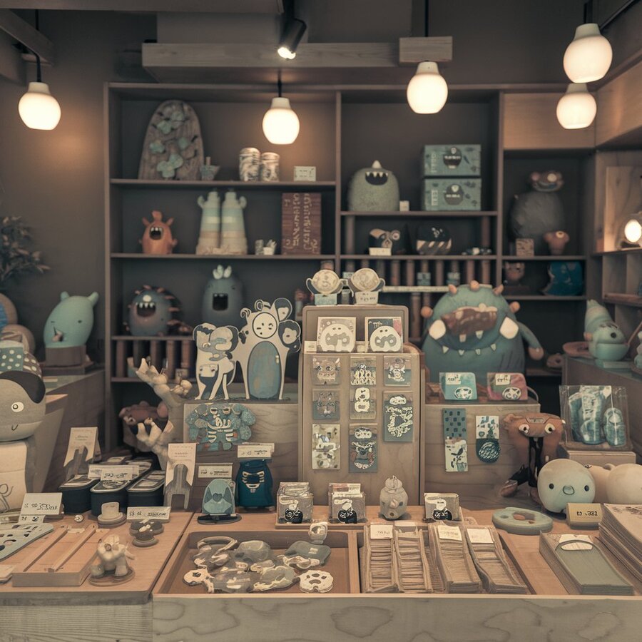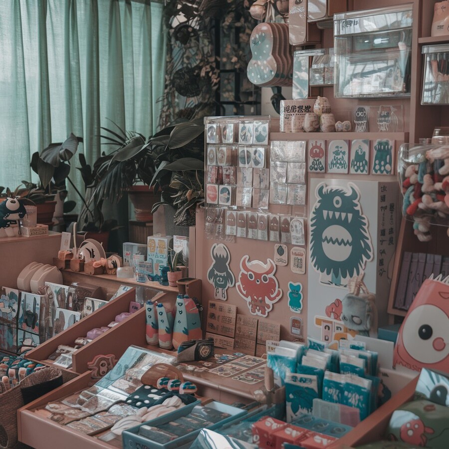 Промпт: A Japanese-style store in muted natural tones with a variety of different children’s toys, stickers, and items with various monsters. There are live flower plants in the store.