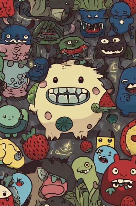Промпт: A children’s drawing pad in Japanese vector style. It depicts a large number of different monsters, plots, and objects. The illustration is made in muted natural green, red, blue and yellow colors. The character of a child is naive. It shows inscriptions in Japanese and a vector image of strawberries