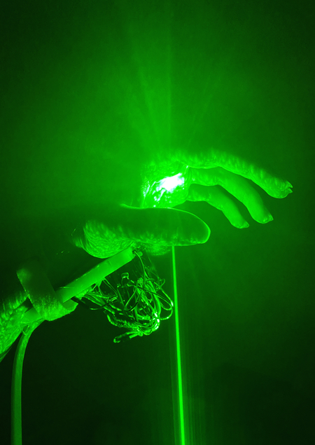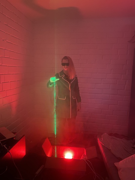 Выступление происходит в темноте, воздух окутан туманом из дым-машины. По заранее записанной программе происходит движения лазерных лучей, на которые в реальном времени влияют движения рук перформера.