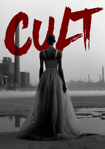 Promt: Design a modern brutalist concrete building for a selective second-hand store in a vast, deserted landscape. The architecture features sharp angles, heavy overhangs, and stacked blocks, with large floor-to-ceiling windows framed by white curtains. A prominent 'CULT' sign is displayed on the building. The environment is minimal and barren, with fog or dust enhancing an eerie, isolated mood. The palette is gray with subtle black and red accents, combining dystopian, avant-garde, and rebellious aesthetics for a cinematic and powerful atmosphere.
