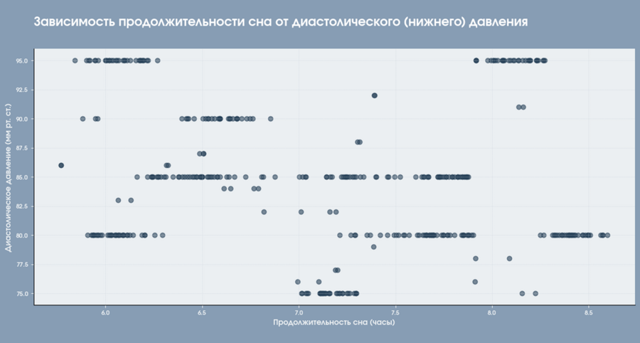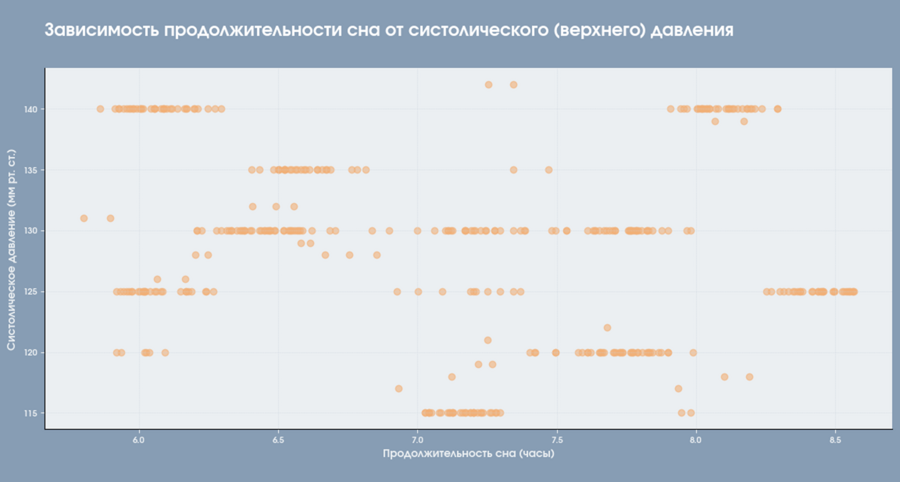 Чёткой линейной зависимости между продолжительностью сна и давлением не наблюдается. Однако можно отметить, что у большинства людей с нормальным или немного повышенным давлением продолжительность сна составляет около 7–8 часов. Это может говорить о том, что в пределах нормы давление не оказывает сильного влияния на продолжительность сна.