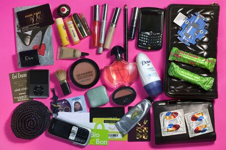 Серия фотографий с содержимым женских сумок на черном фоне, часть съемки «Photos of the Fascinating Things Women Keep in Their Bags» автор Сергей Строителев