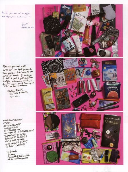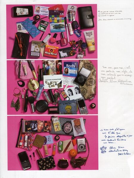 Подписи владелиц сумок к фотографиям «Elles Vident Leur Sac» с их содержимым, для журнала Clam, 2010, автор Пьер Кляйн