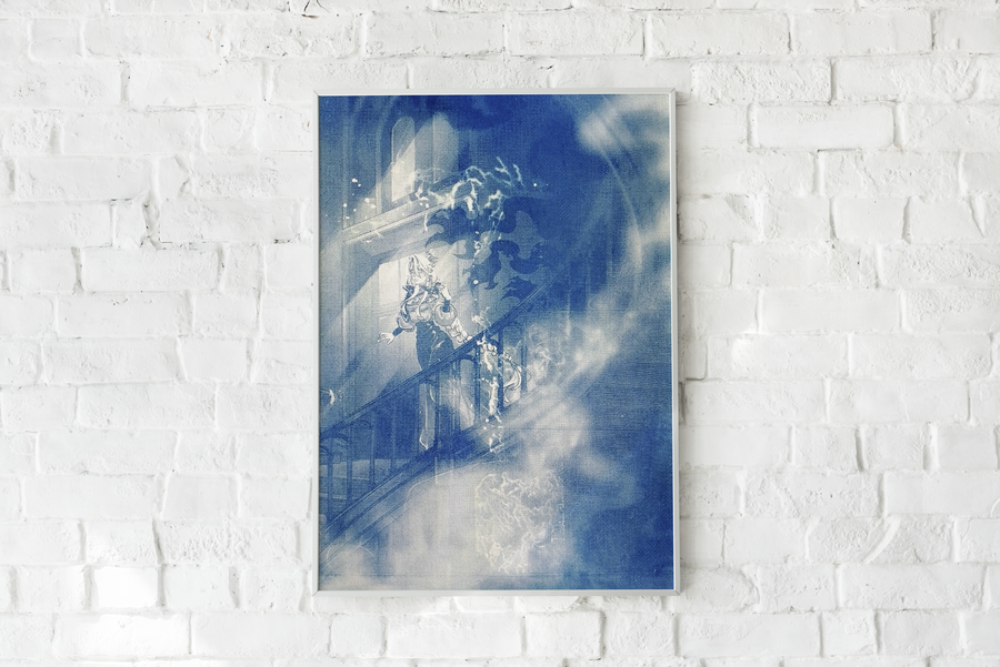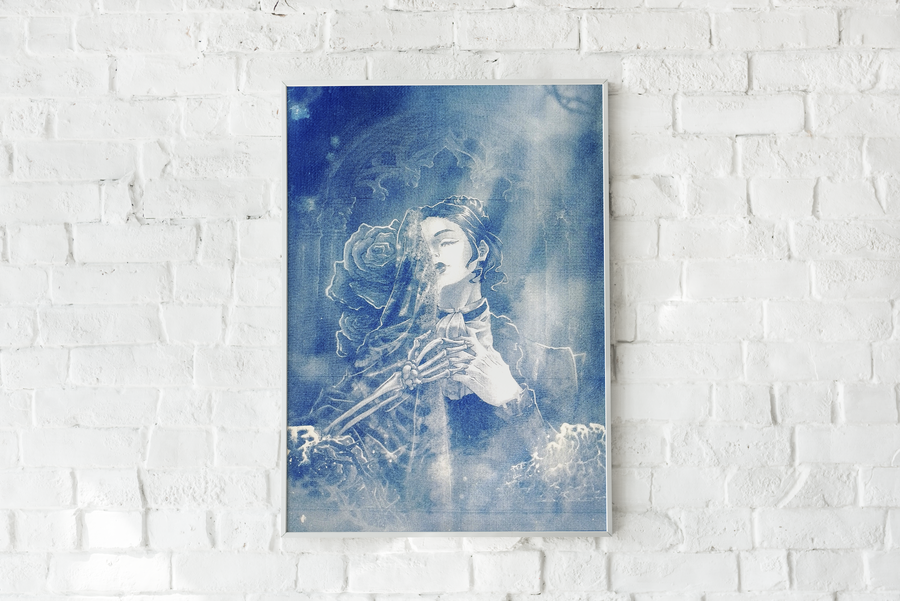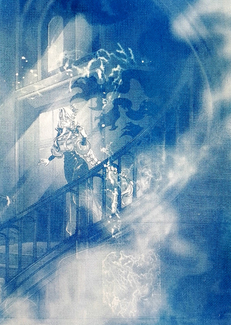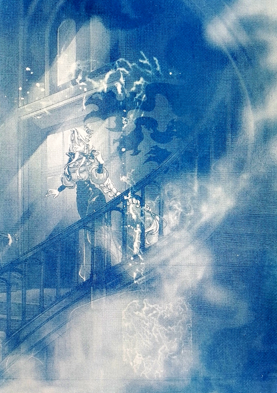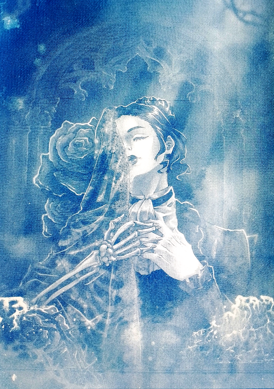Проект представляет собой серию иллюстративных плакатов к авторскому сюжету, выполненных в технике цианотипия. Это сказочный, наполненный мистикой сюжет, чей мрачный, потусторонний дух отлично передает выбранная техника. Потертости и пятна визуально состаривают картину поддерживая тематику историй о призраках, создавая впечатление винтажных карточек.