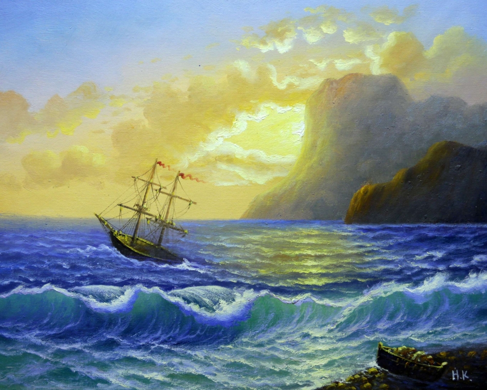 Как мы можем увидеть, хоть нейросеть и неидеально справляется с такими тонкостями, как формы волн и мелкие детали камней и кораблей, стиль Айвазовского узнаётся в композиции, нежной текстуре воды, неба, а так же в цветовой палитре, достаточно точно воссозданной и приближенной к оригинальным картинам художника.