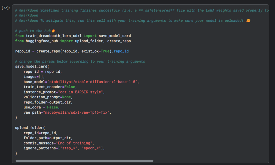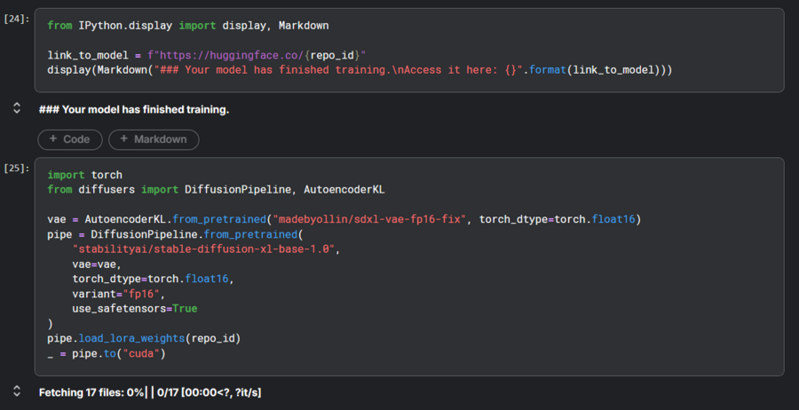 Затем модель подгружается на huggingfacehub, где доступна для использования и генерации новых изображений