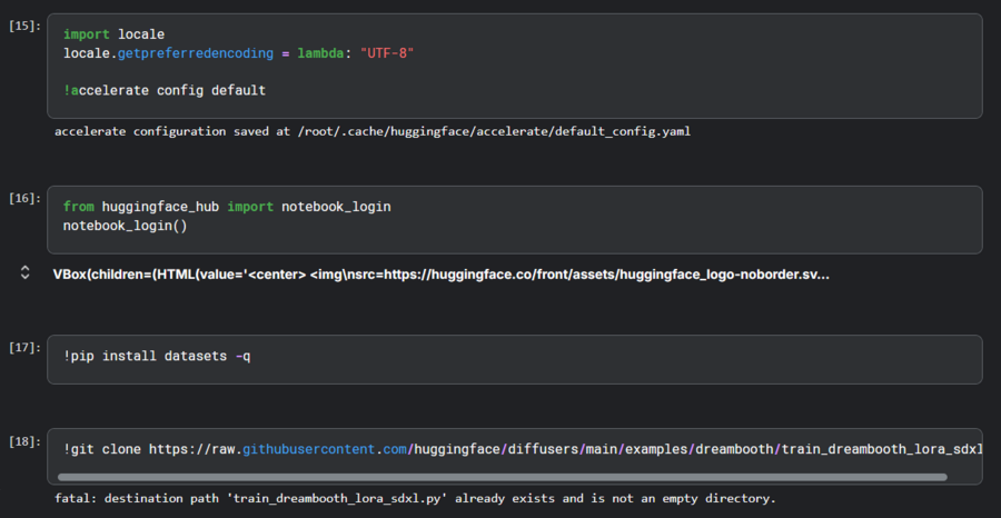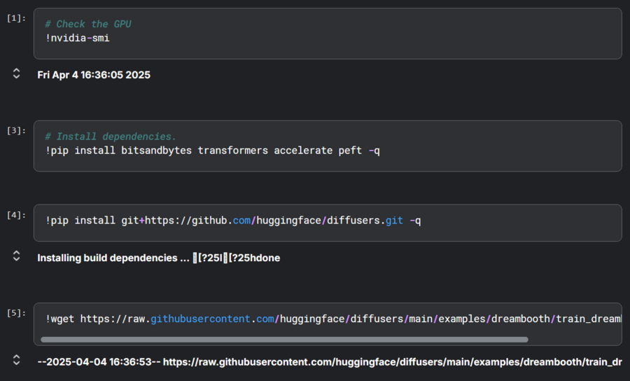 Далее были проверены GPU и установлены зависимости, а также подключен датасет подгруженных фотографий Барсика.
