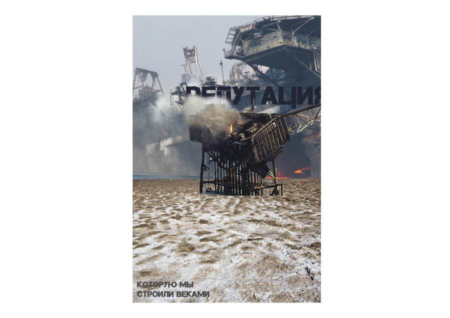 Первая графическая серия — это серия девизов, которая показывает абсурдность пафосных лозунгов на фоне разрушающегося постапокалиптического мира.