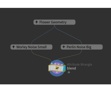 Чтобы добиться еще более естественной деформации, можно комбинировать несколько шумовых паттернов с разным масштабом и уровнем детализации. Попробуем сделать это, используя разные входы Attribute Wrangle.