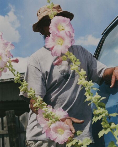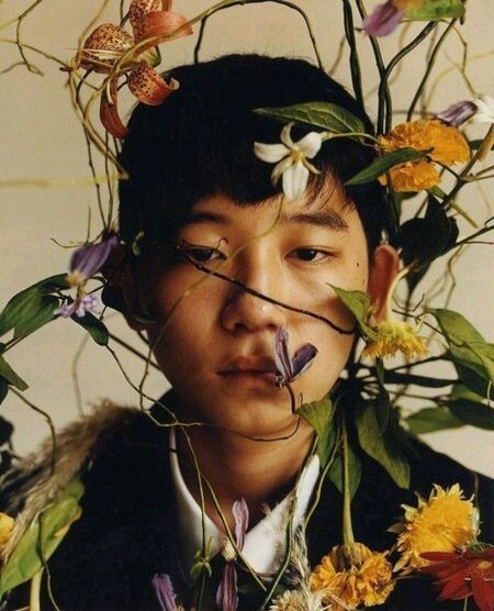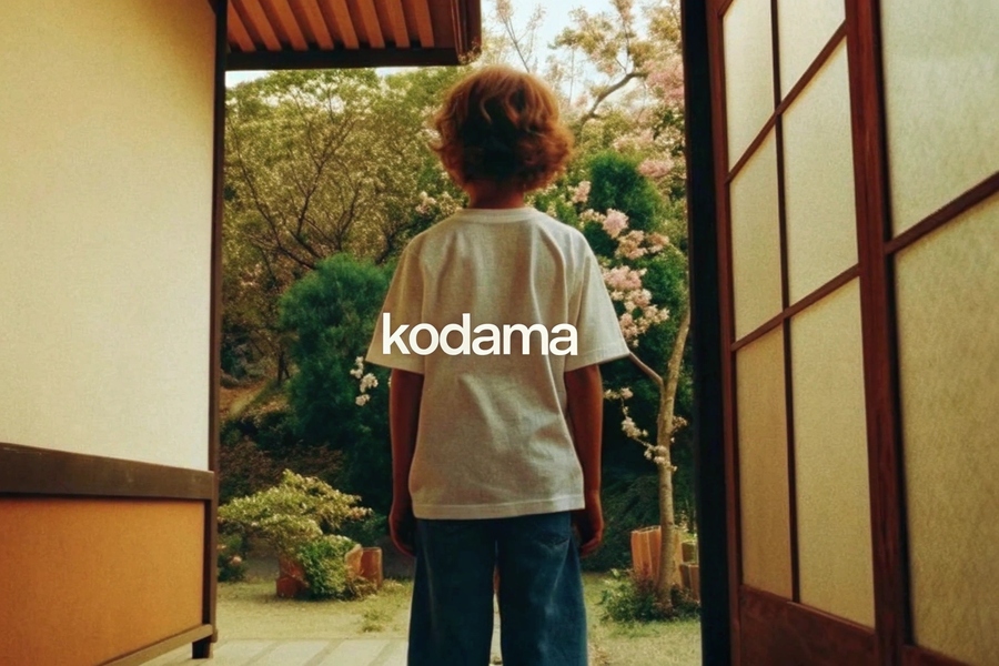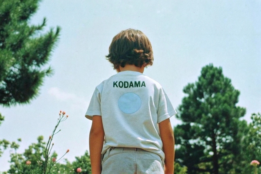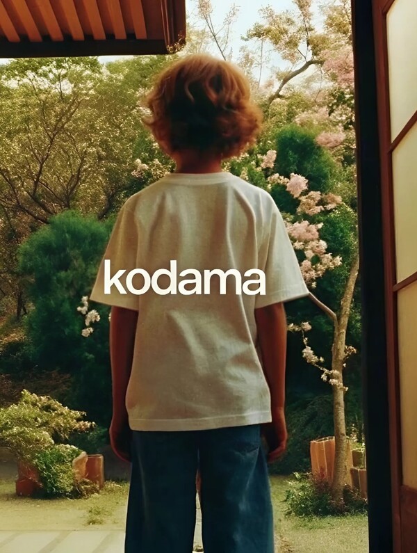 /image prompt: T-shirt with the text 'KODAMA' in a round font style on the T-shirt. The child model is standing outside near the trees and flowers, shot in a film-style aesthetic with soft lighting, Japan style, eco atmosphere.