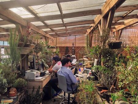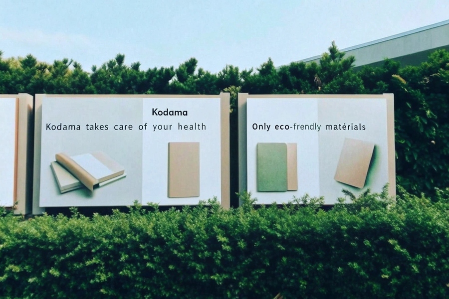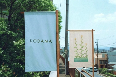 /image prompt: atmospheric advertising postes for advertising in city for 'KODAMA' with logo. Textured handmade paper with a texture in soft neutral tones, such as beige and off-white, light green, with elements of colors and plants eco-friendly appearance, minimalism.