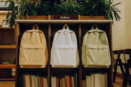 /image prompt: school bags for Japanese stationery brand for schoolchildren from Japan 'KODAMA', pure neutral colors such as beige, white, light brown, light green.