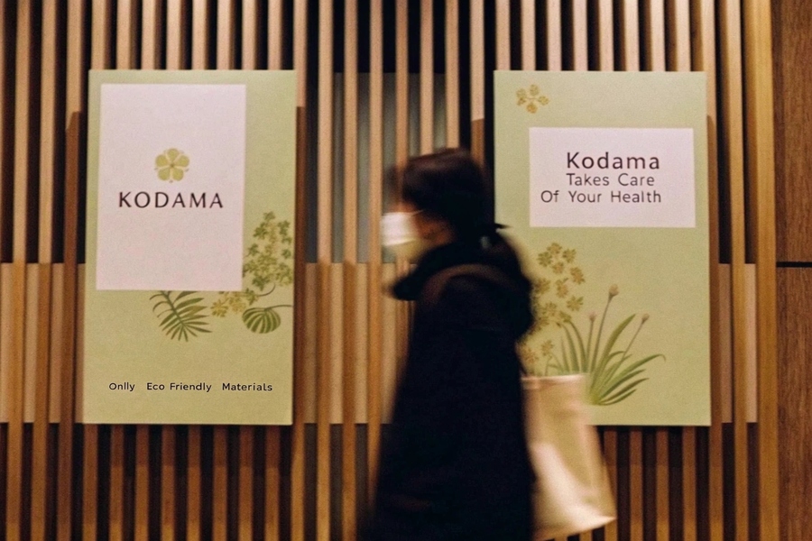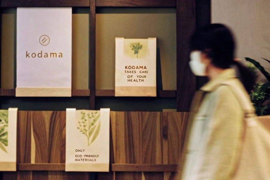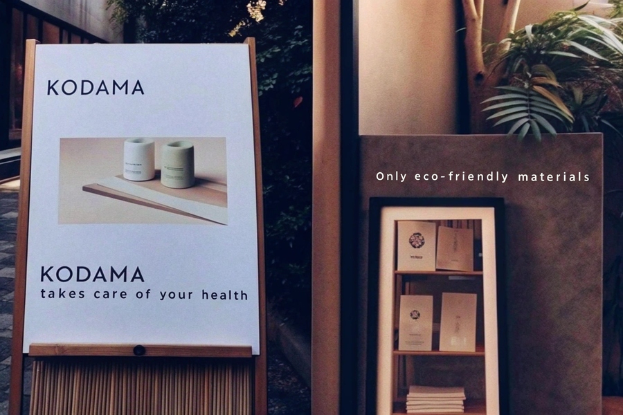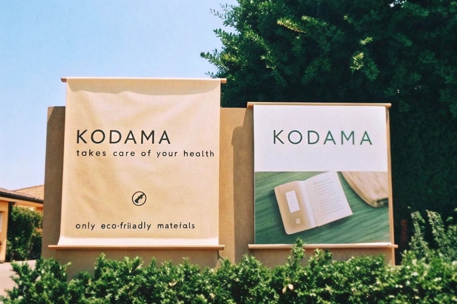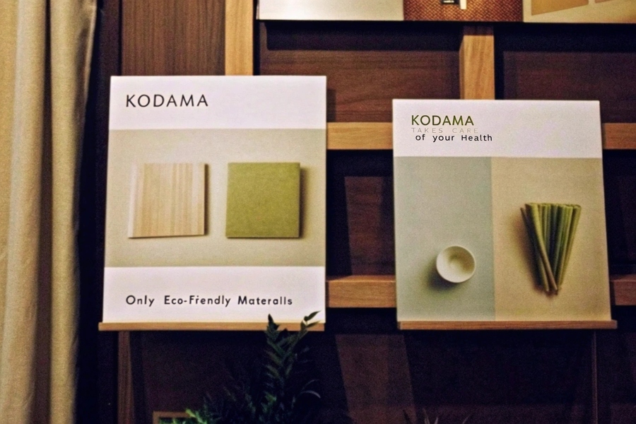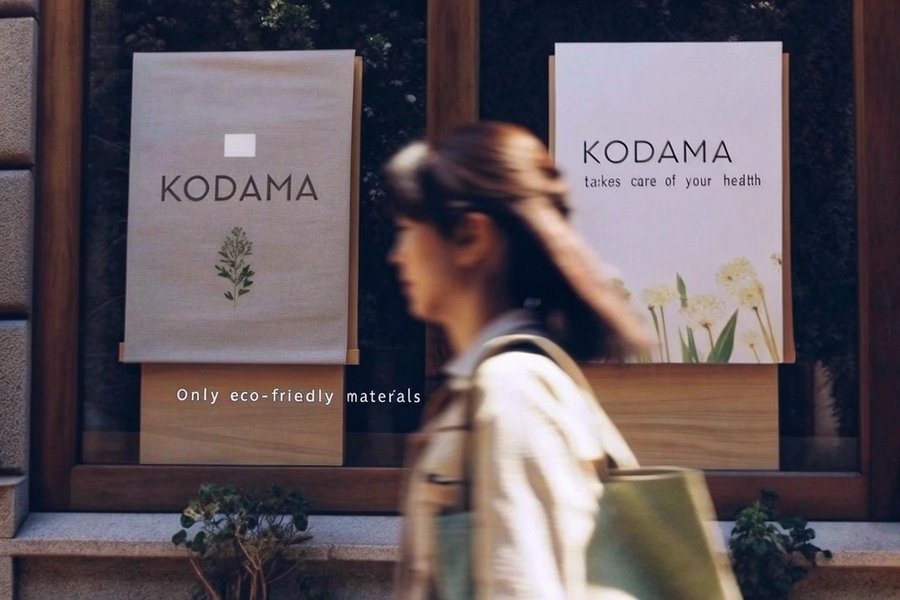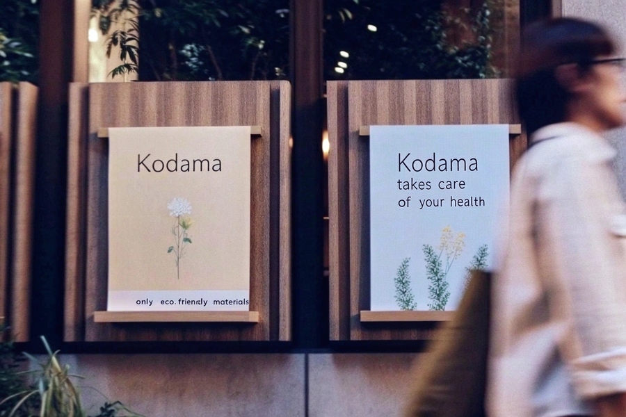 /image prompt: several posters in the minimalist style, placed on the wall and featuring an eco-friendly design and atmosphere. Each poster is made with soft, organic typography with drawings of flowers and Japanese plants. The inscriptions 'KODAMA', 'KODAMA TAKES CARE OF YOUR HEALTH' and 'ONLY ECO-FRIENDLY MATERIALS', made in natural tones such as beige, muted green and a blurred person passing by in motion.