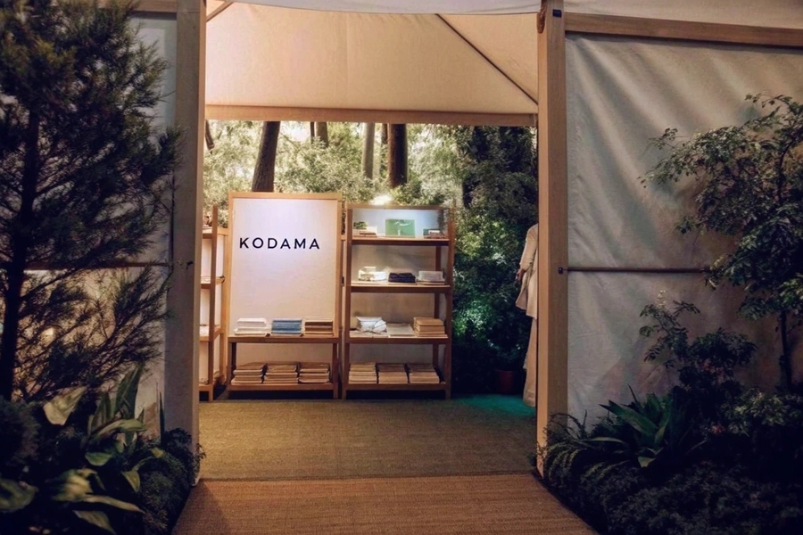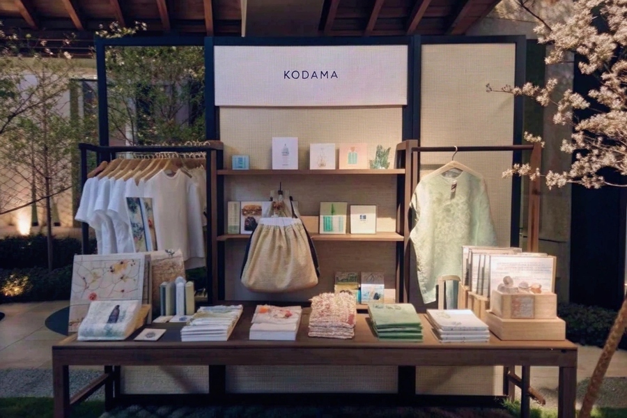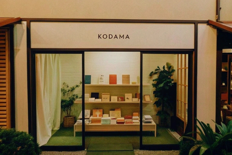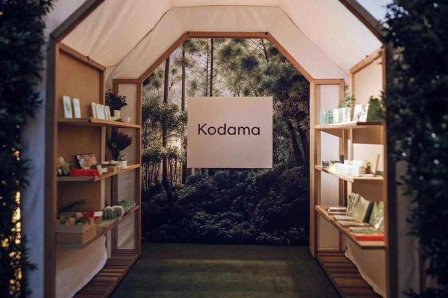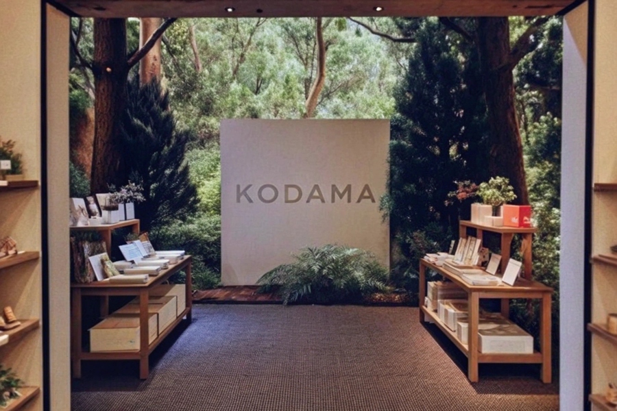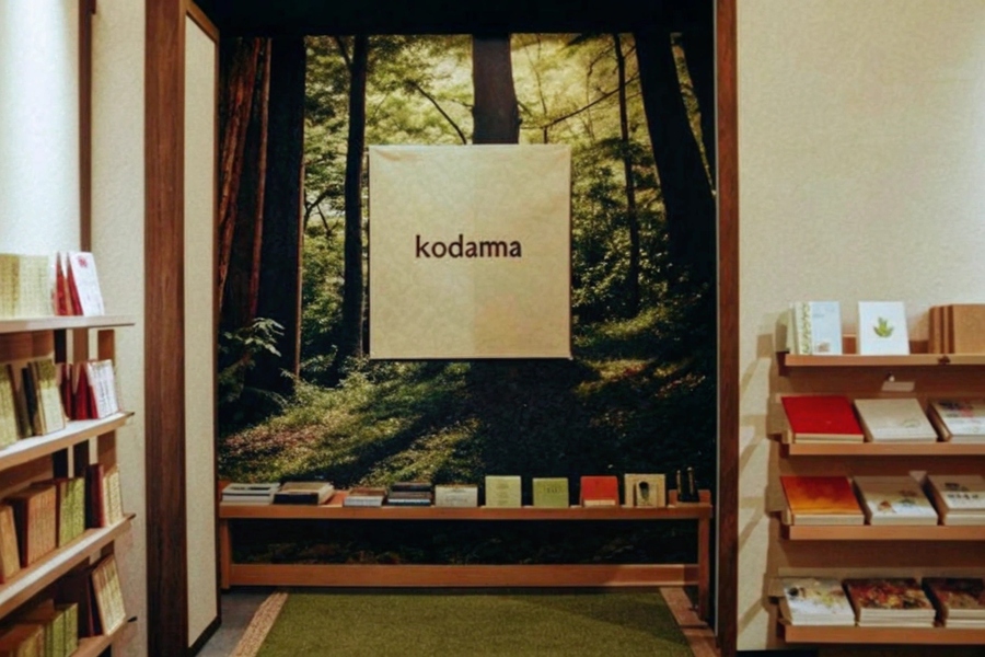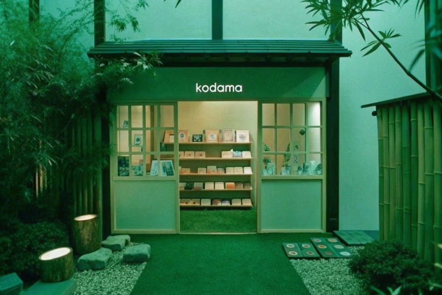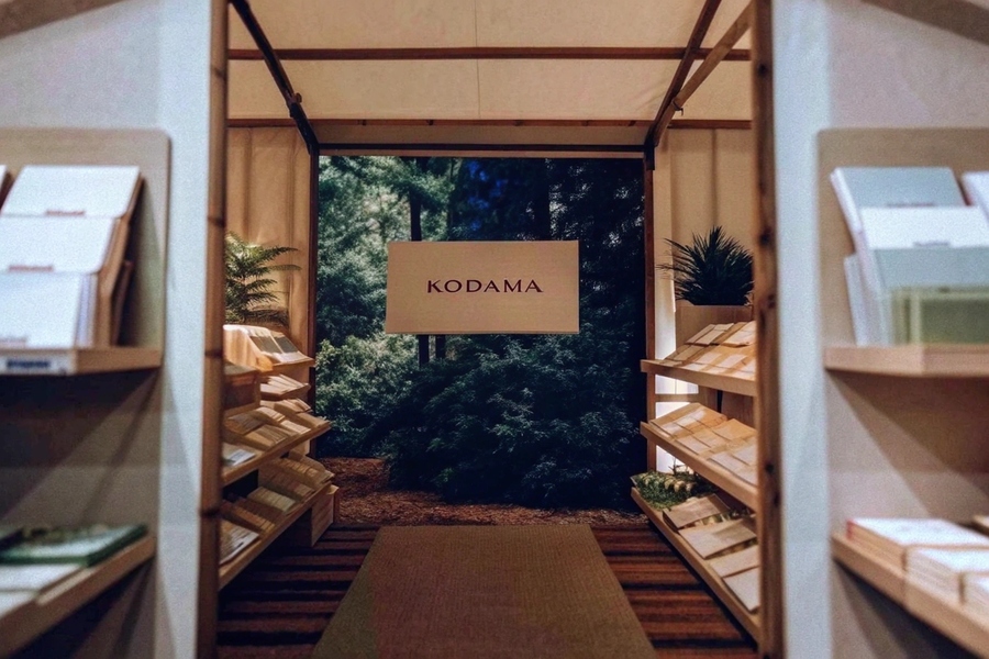 /prompt: design shop which looks like a japan forest for brand 'KODAMA' of eco-friendly stationery from Japan, with stationery products made in soft neutral tones such as white, beige, light green, eco-friendly appearance.