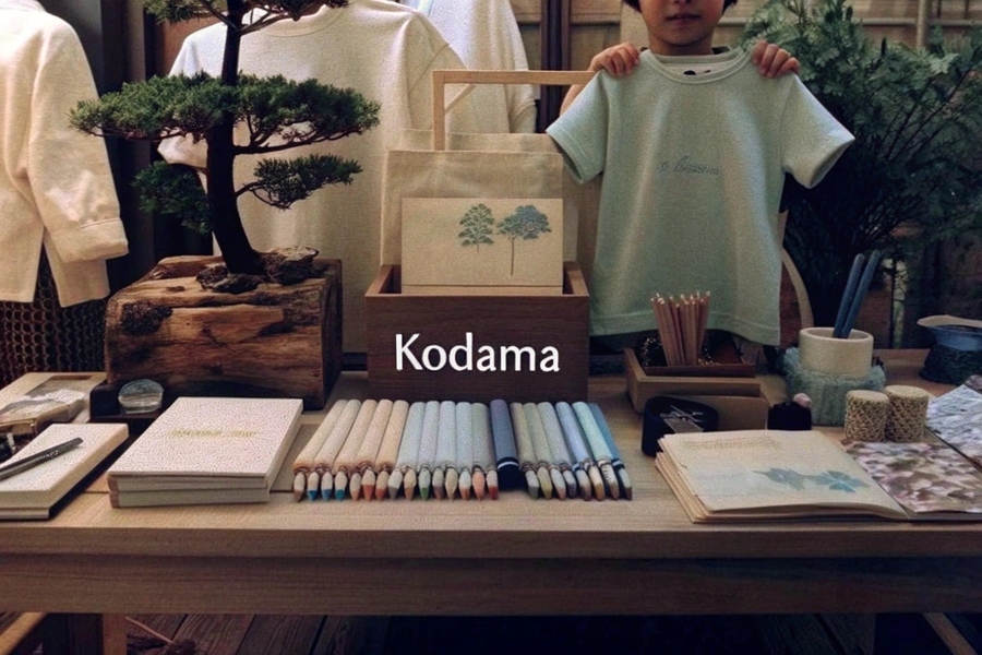 /prompt: design the merch for brand 'KODAMA' of eco-friendly stationery from Japan, with stationery products, bags, t-shirts on kids made in soft neutral tones such as white, beige, light green, eco-friendly appearance.